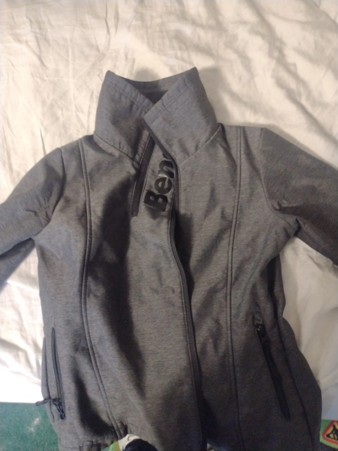 Grey soft shell jacket. Size medium. Features a high collar and zipper closure. Two zippered pockets. Excellent for layering.
