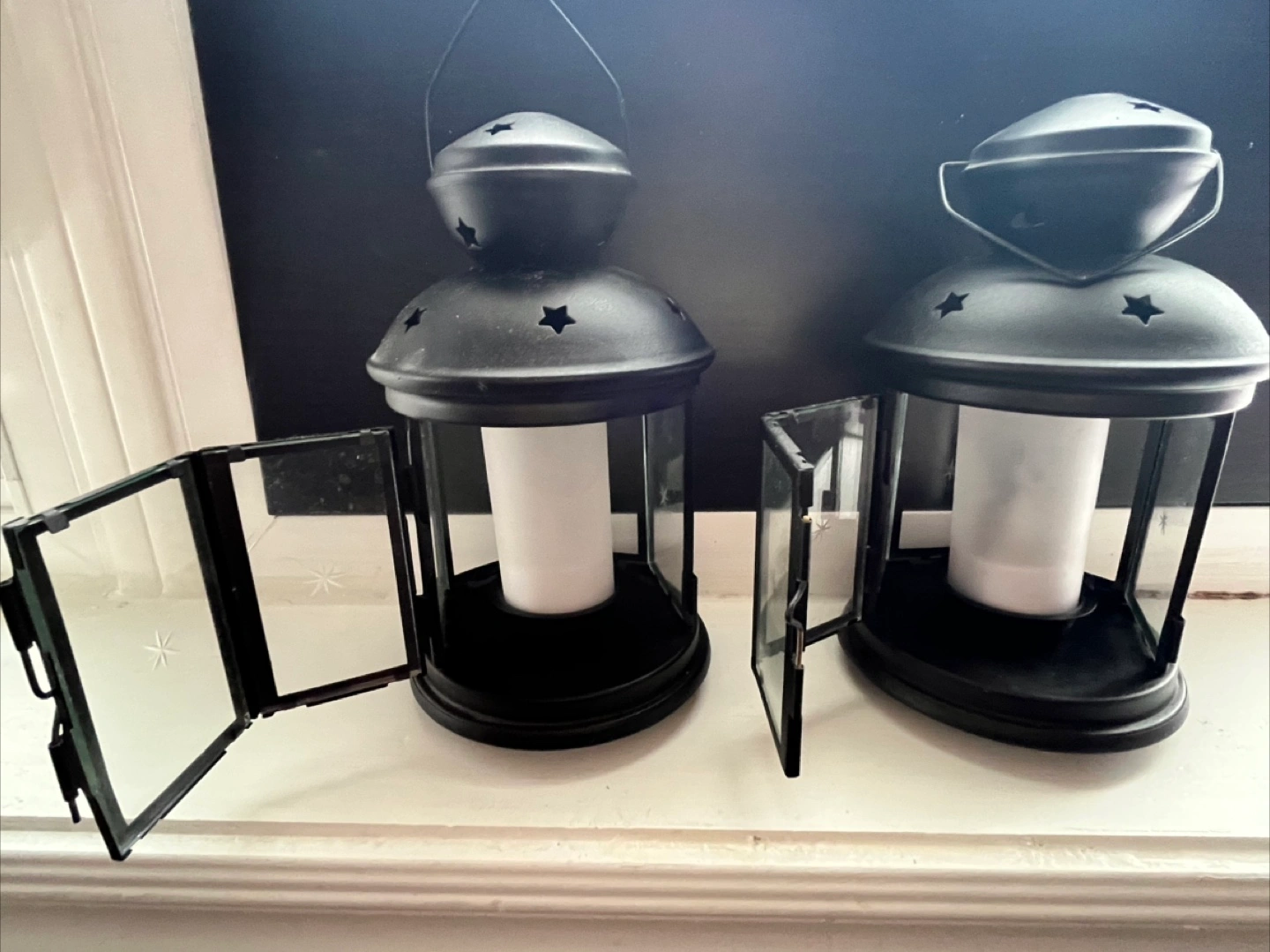Two black metal lanterns. Star cutouts. Glass panels. LED candle included. Perfect for home decor.