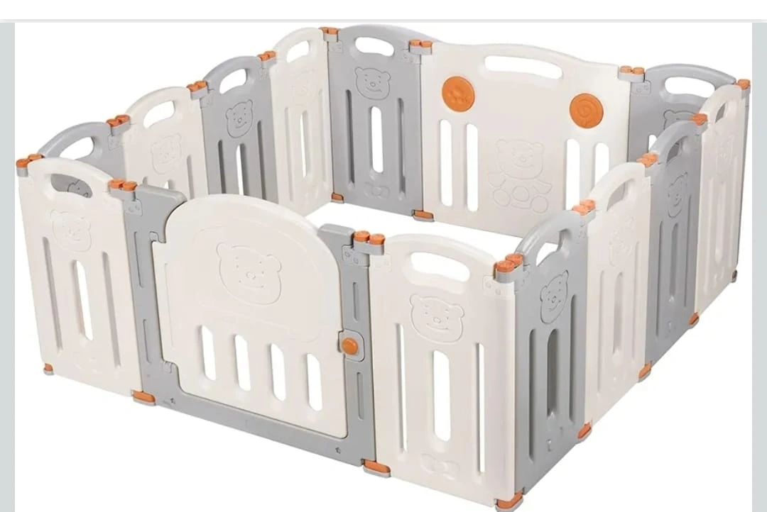Large playpen, twelve panels, grey and white colour scheme. Bear designs on panels. Easy to assemble and disassemble. Great for keeping your little one safe and contained.