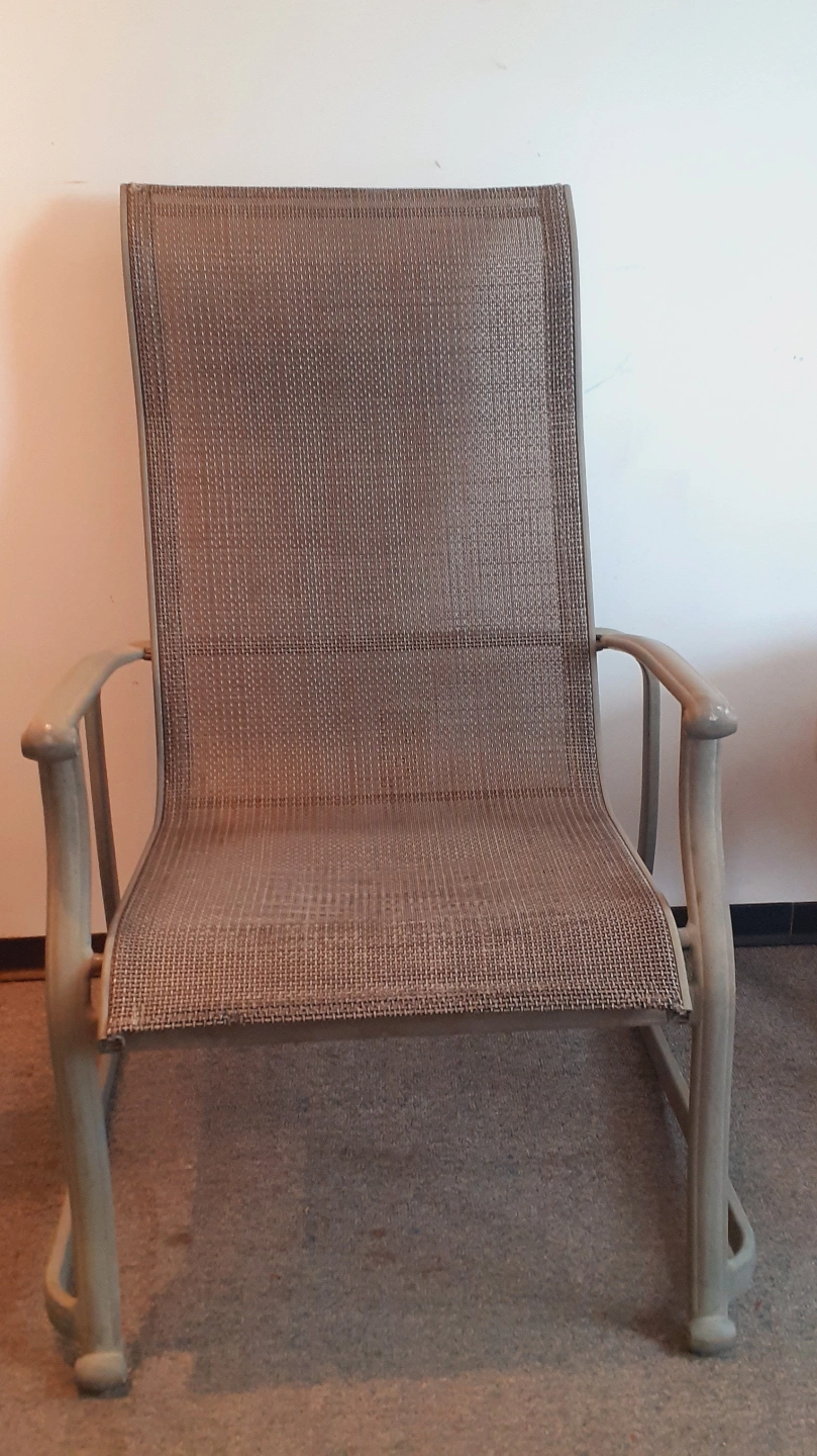 Aluminum frame patio chair. Beige sling seat and back. Used condition.