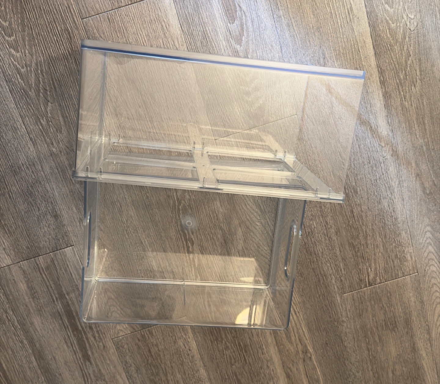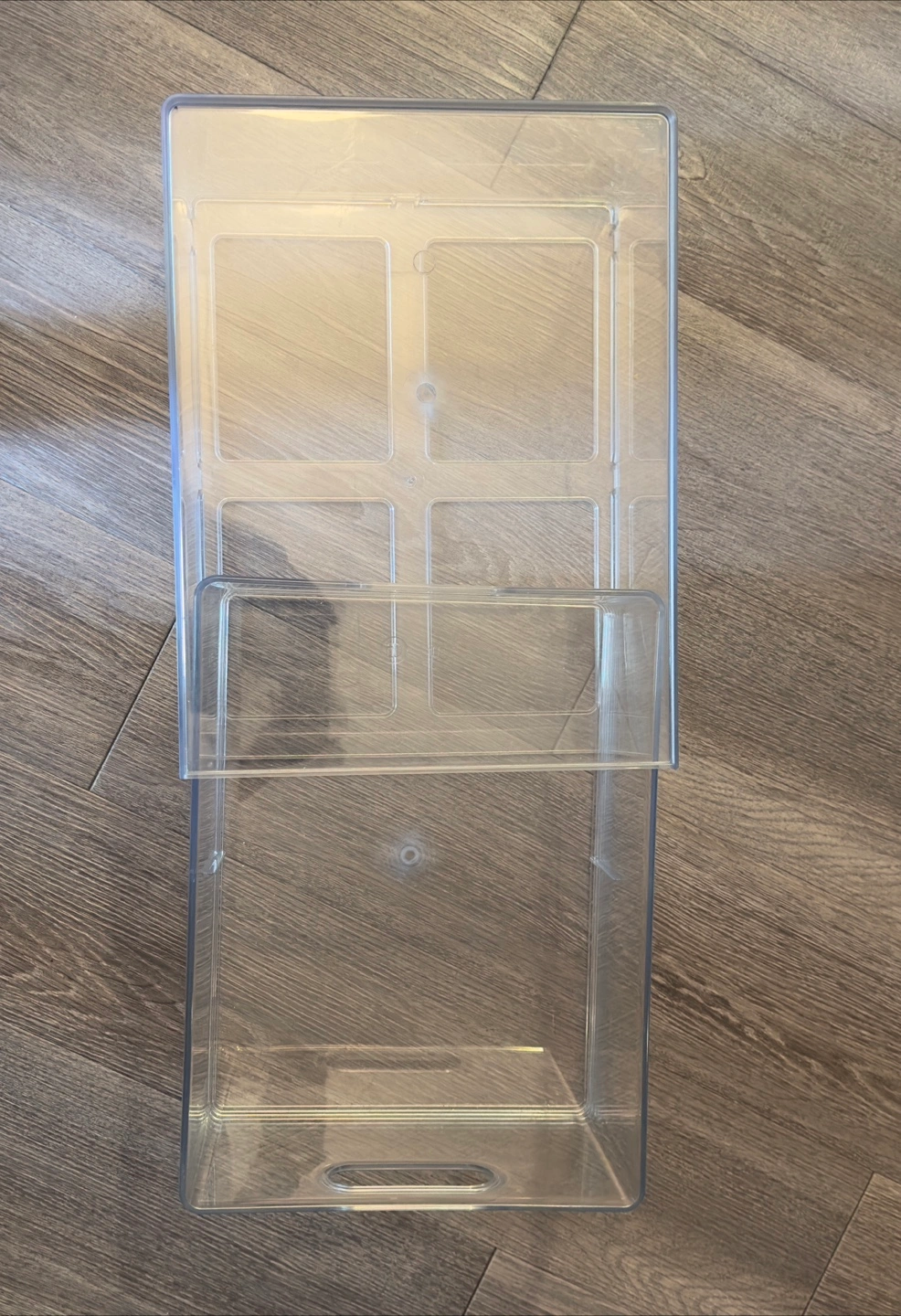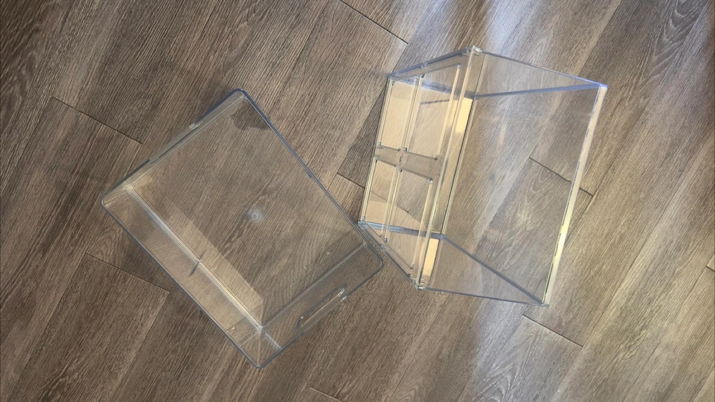 Set of two clear plastic storage bins. Stackable design. Great for organizing small items. One bin has a divided top section.