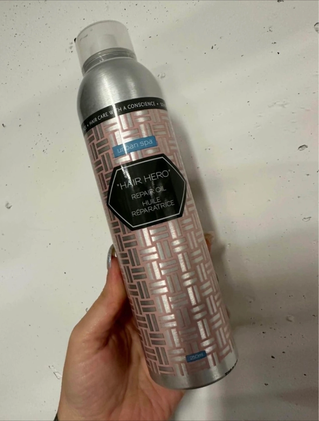 Hair repair oil. Rescue treatment and super shine. Apply generously. For all hair types. Salon-quality look. Sustainable packaging.
