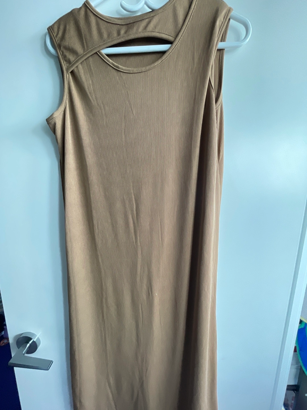 Stylish brown midi dress. Features a ribbed texture and a unique cutout detail at the neckline. Sleeveless design. Perfect for a variety of occasions.