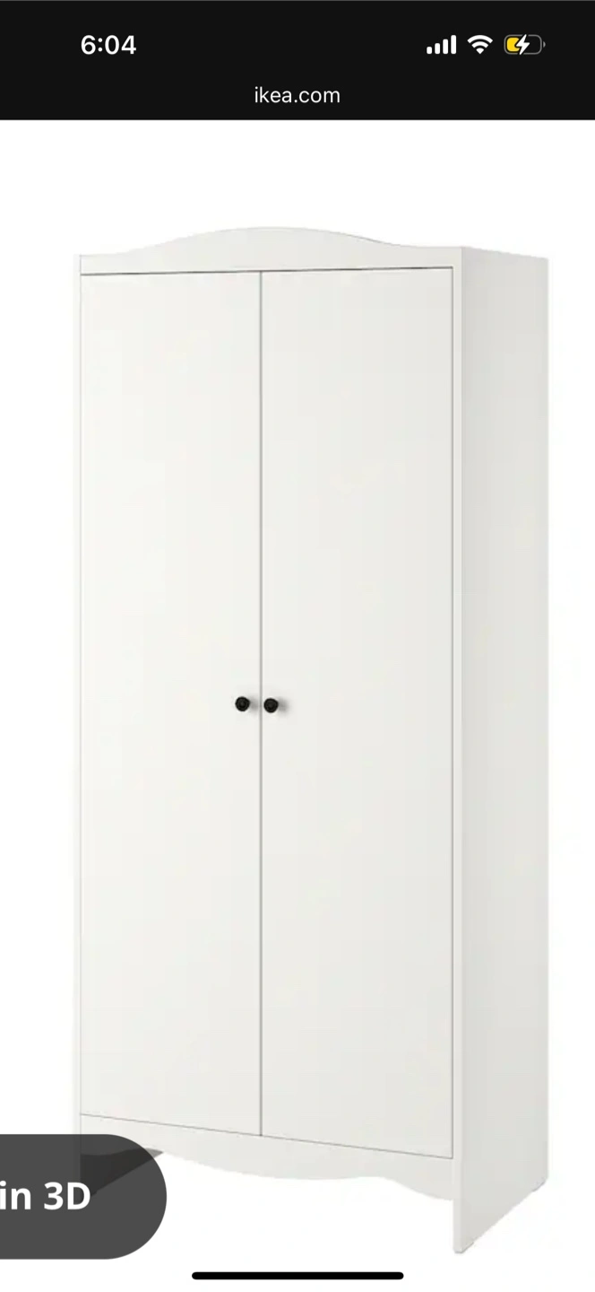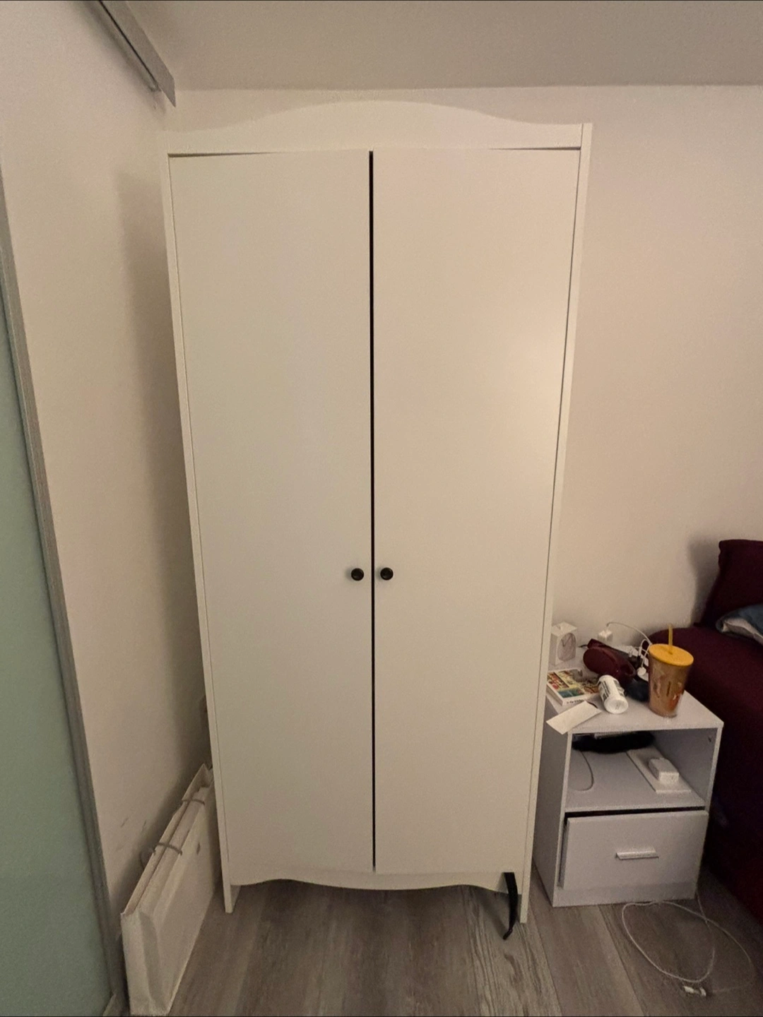 White wardrobe with two doors. Hanging rod and shelf. Good condition.