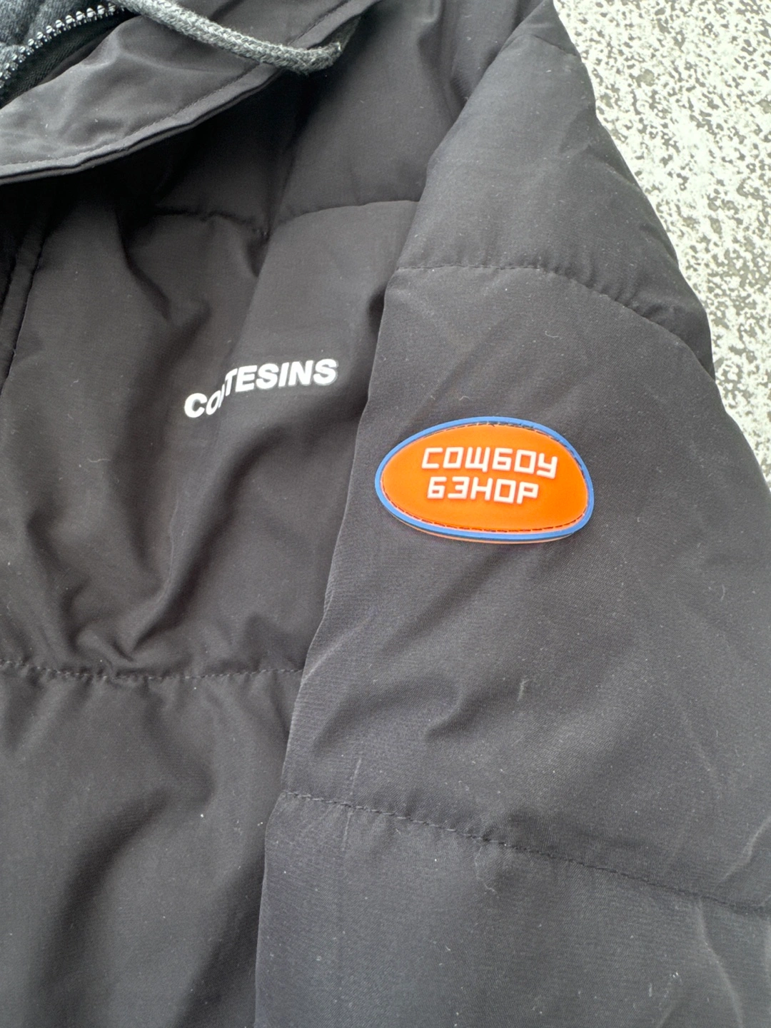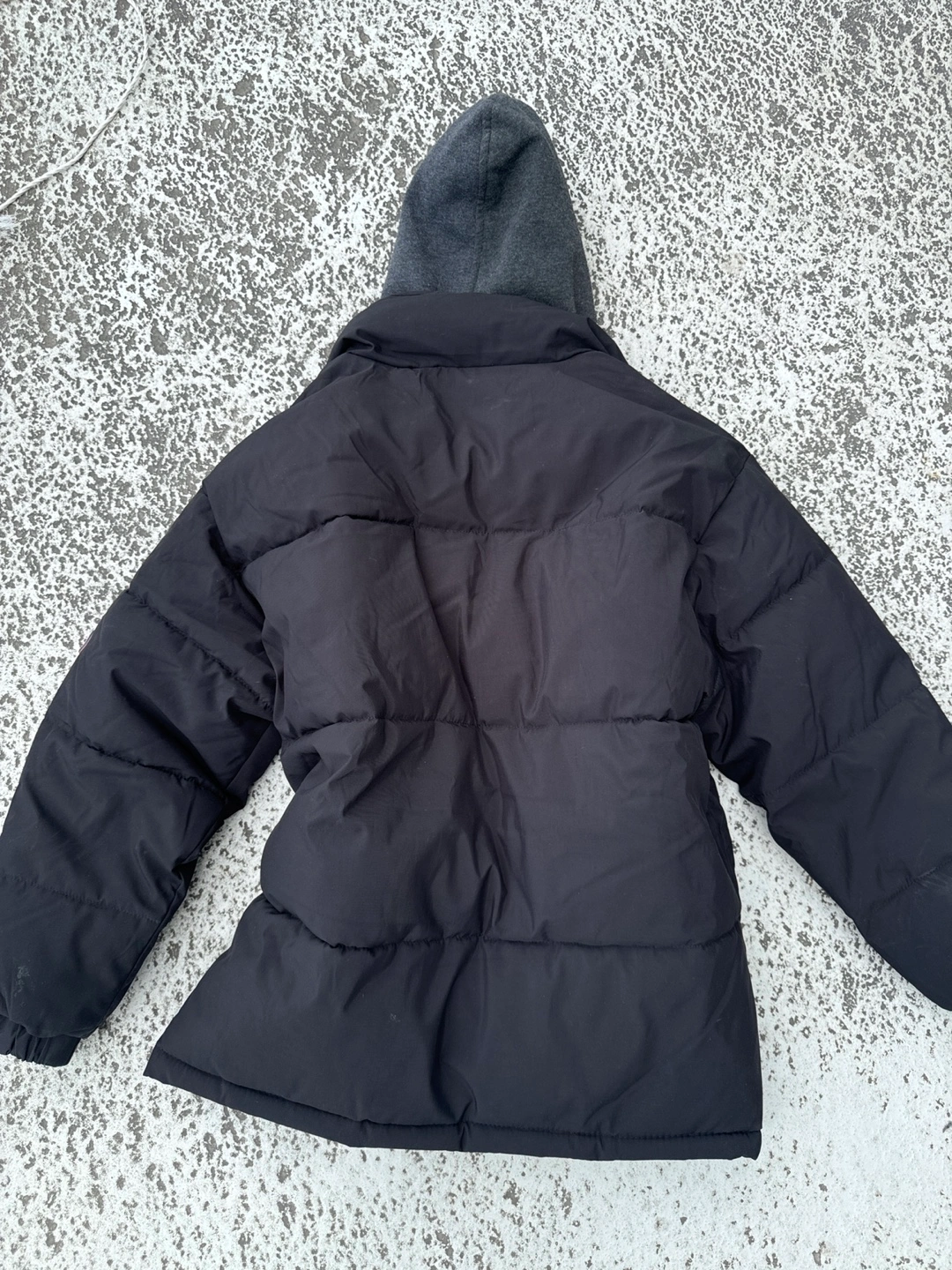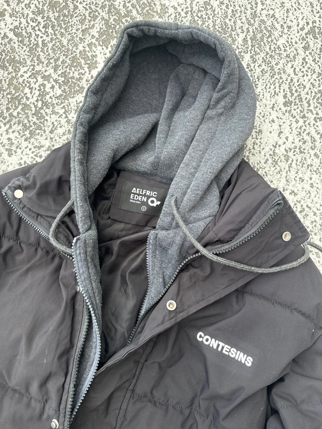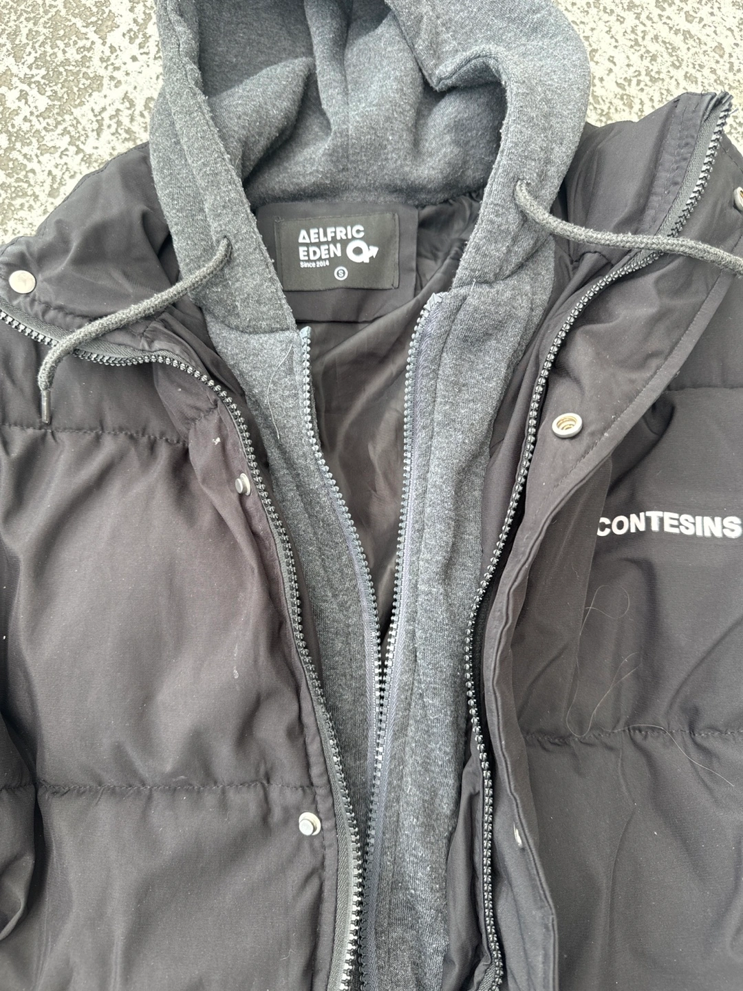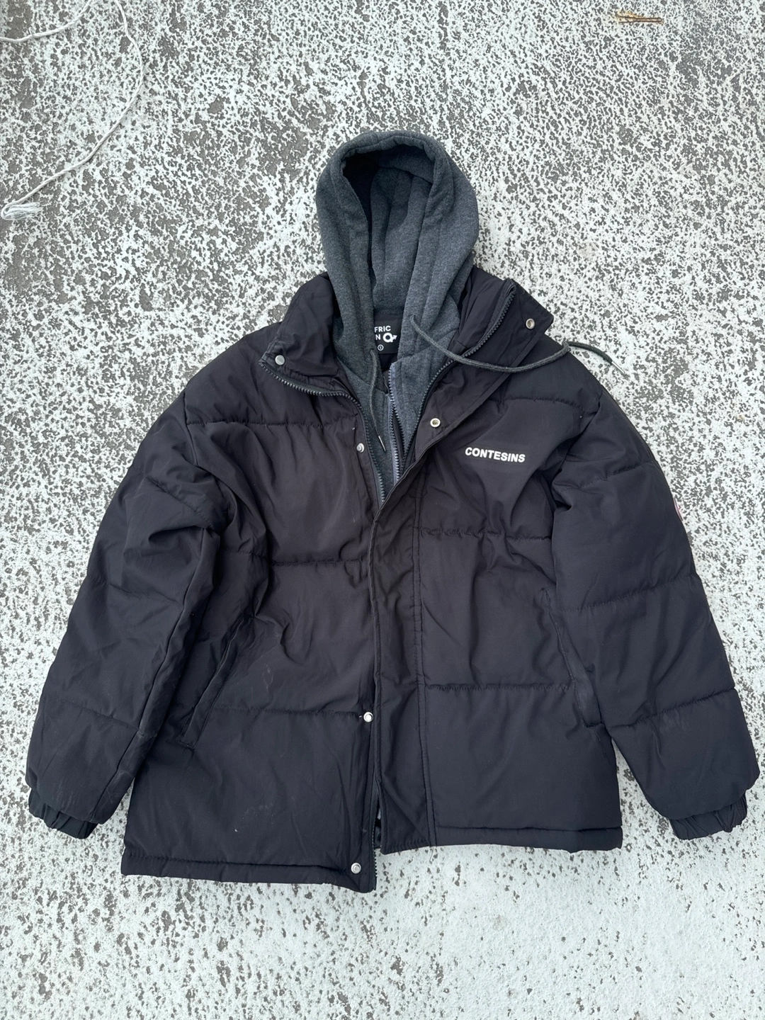 Black puffer jacket. Features a double zip hoodie detail Embroidered branding on the front and sleeve. Good for colder weather.