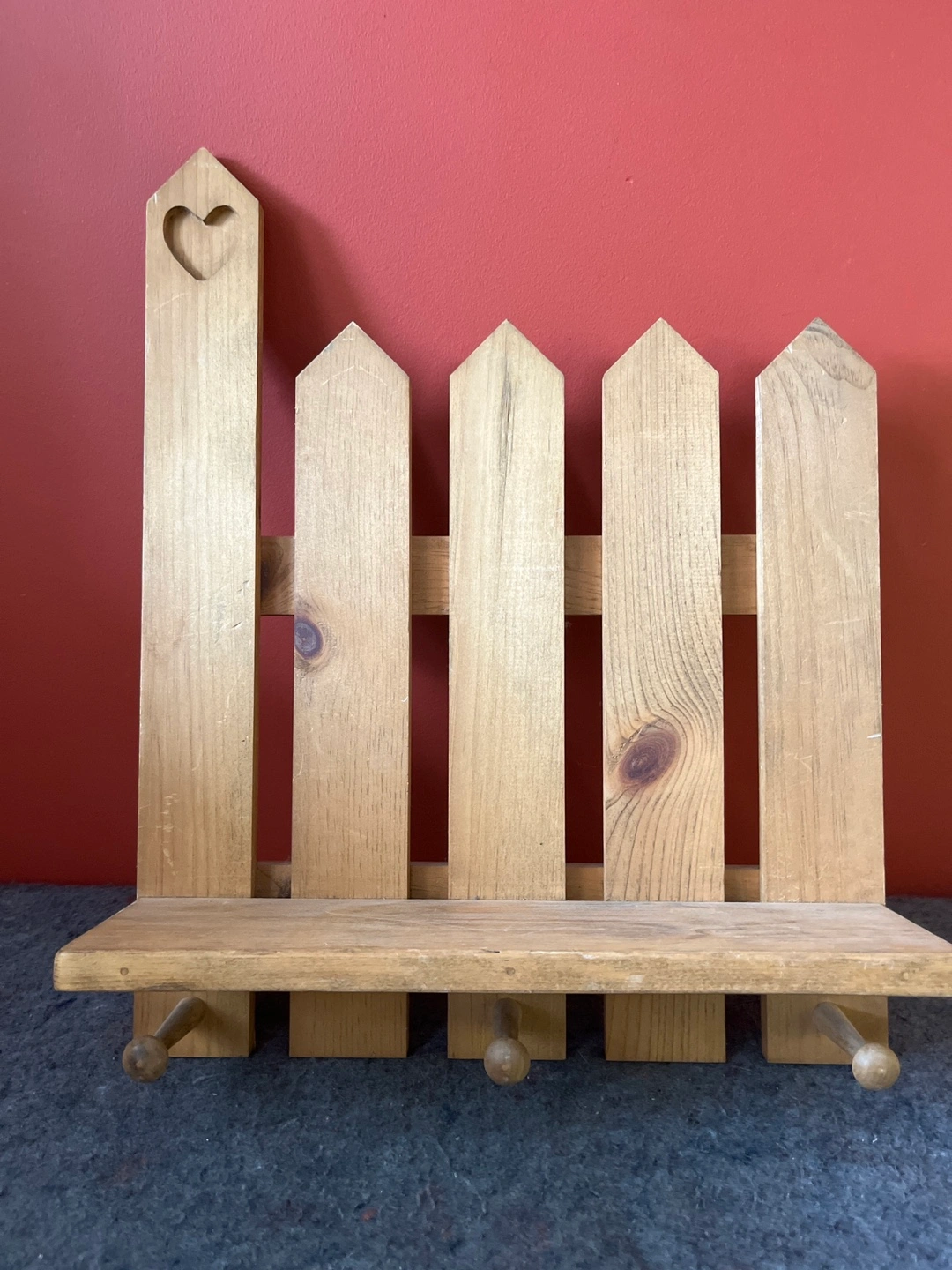 63Adorable wooden shelf, shaped like a picket fence. Features a small heart cutout and three hooks underneath. Perfect for a kitchen or entryway.