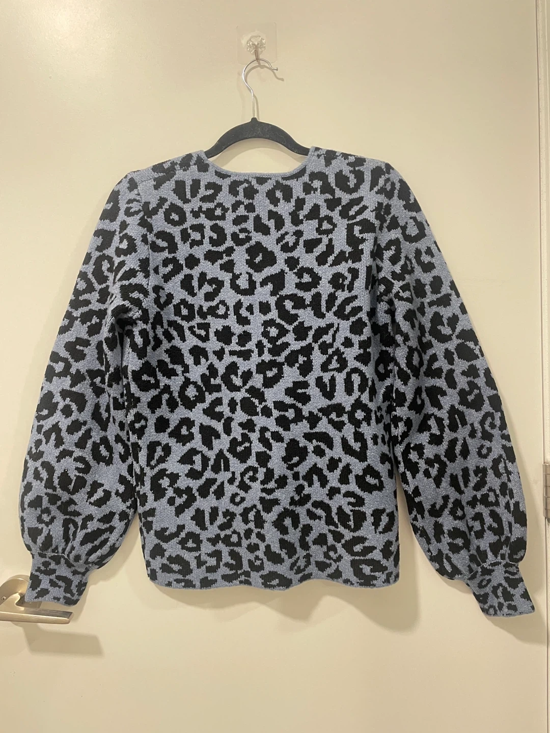 Cute blue and black leopard print sweater. Long sleeves with balloon cuffs. Crew neck. Soft knit material. Perfect for fall or winter.
