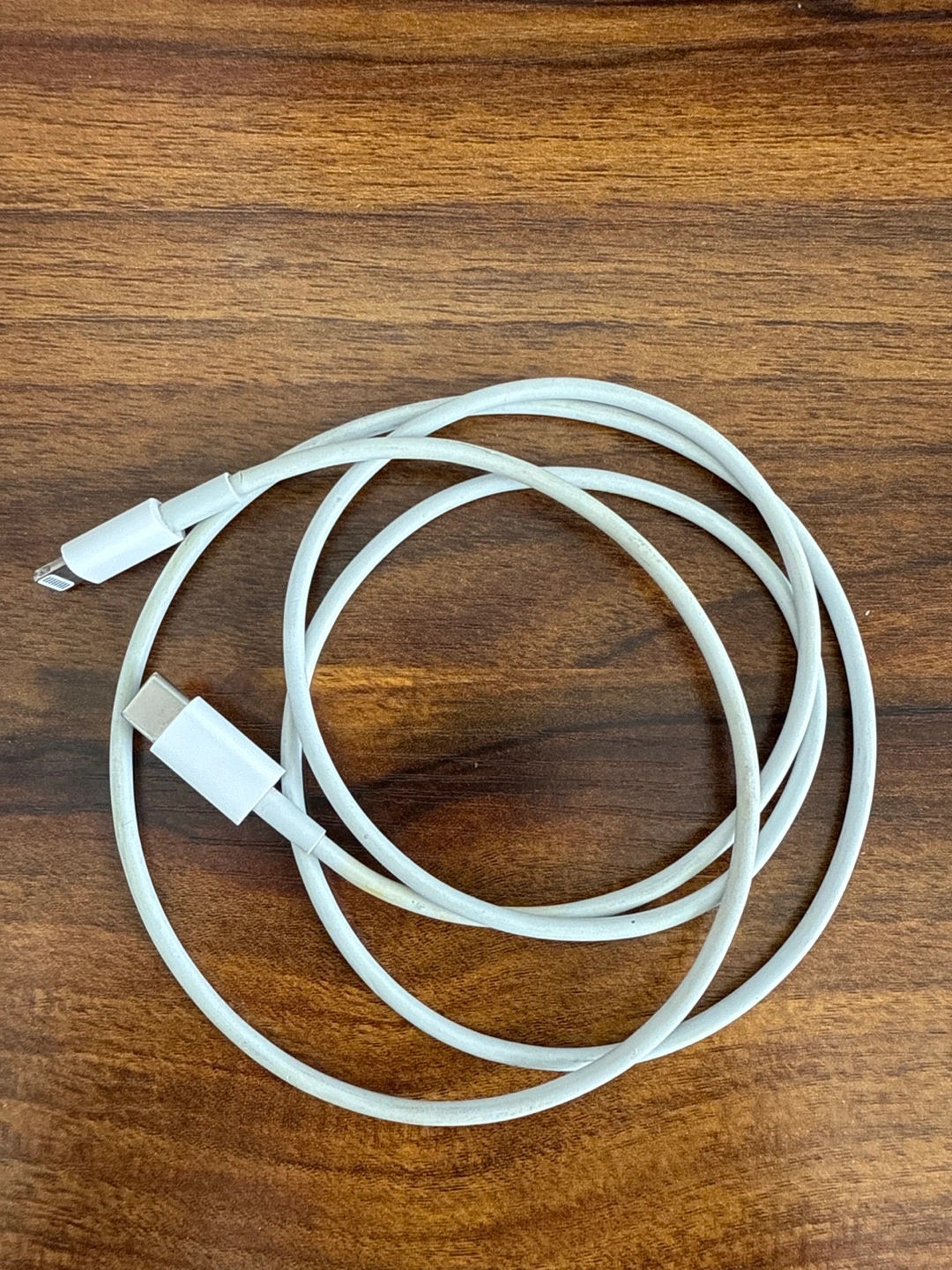 Used Apple USB-C to Lightning cable. White. Shows some signs of wear. 1m/ft. It has a minor tear on one end, but still works.