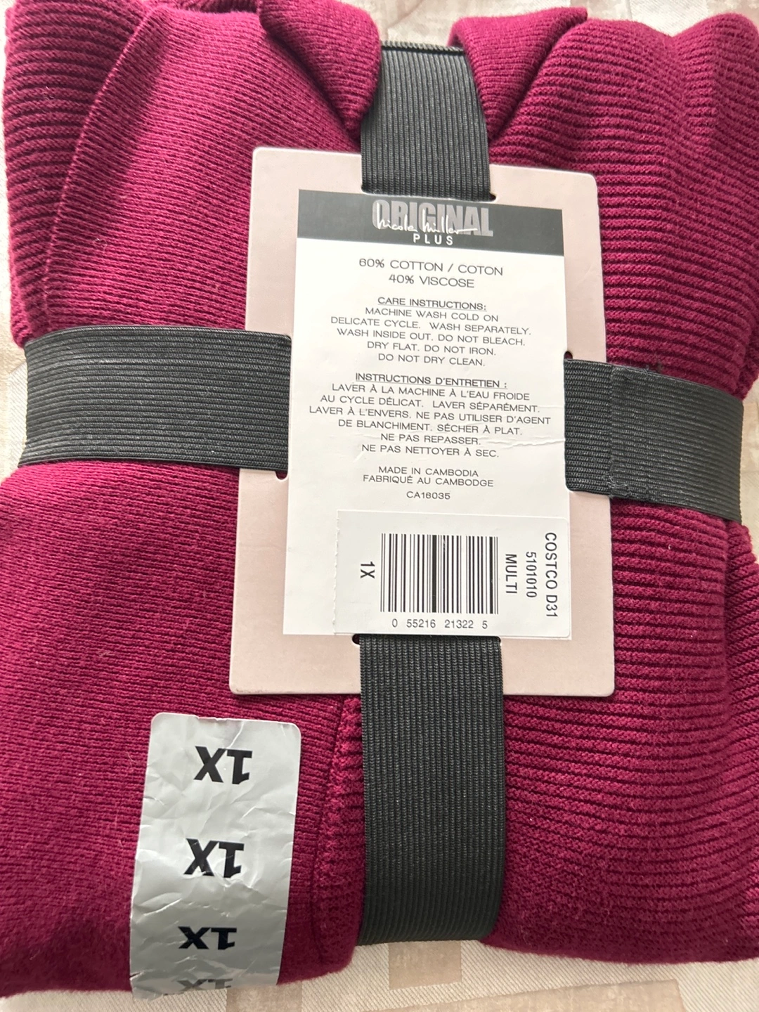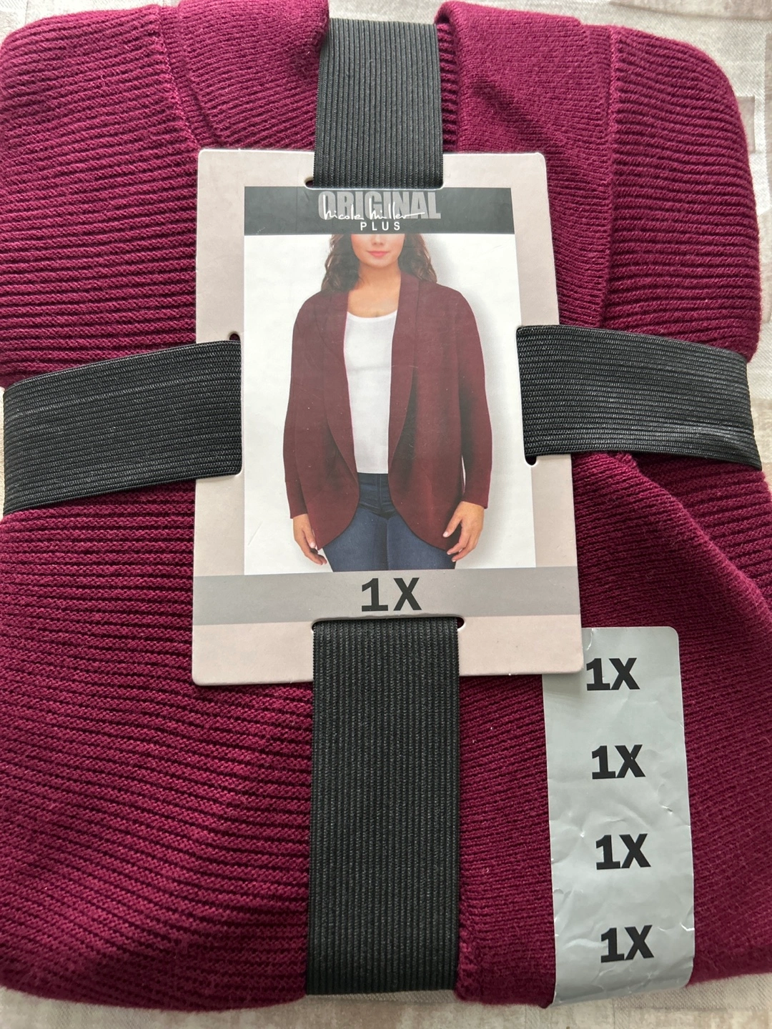 Brand new with tags, burgundy coloured cardigan sweater. Size 1X. 60% cotton, 40% viscose. Machine wash