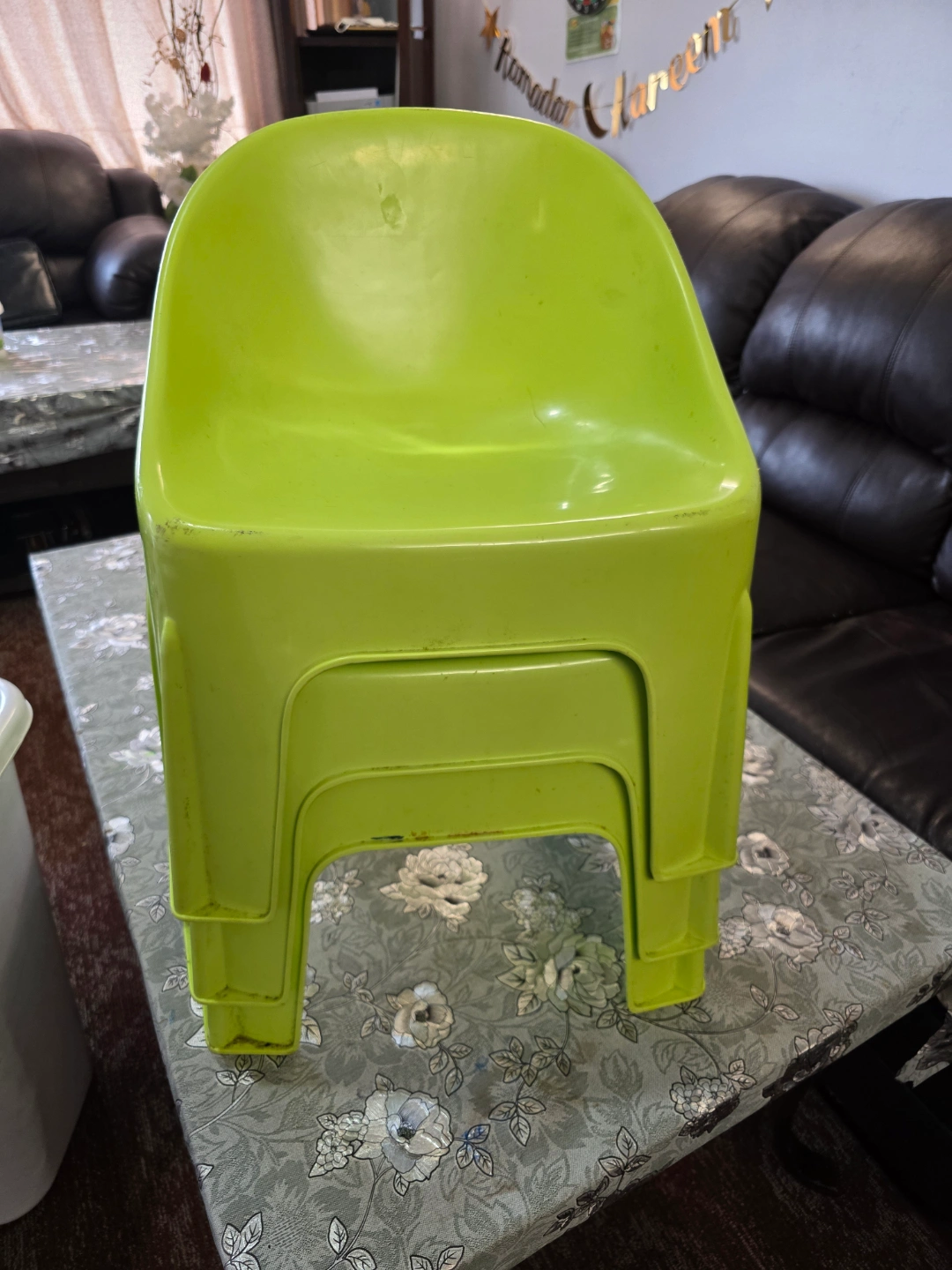Three lime green plastic children's chairs. Stackable design. Suitable for indoor or outdoor use. Minor scuffs and scratches. $5 each pick up 92 mountland drive