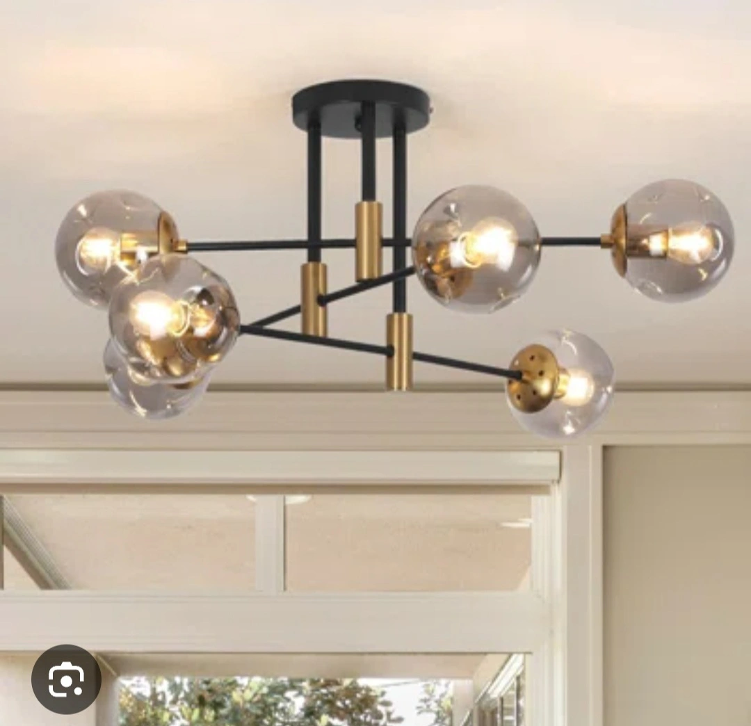 Stunning modern ceiling light. Black and gold finish. Six smoked glass globes. Easy to install. Great for kitchens, dining rooms, or living rooms.