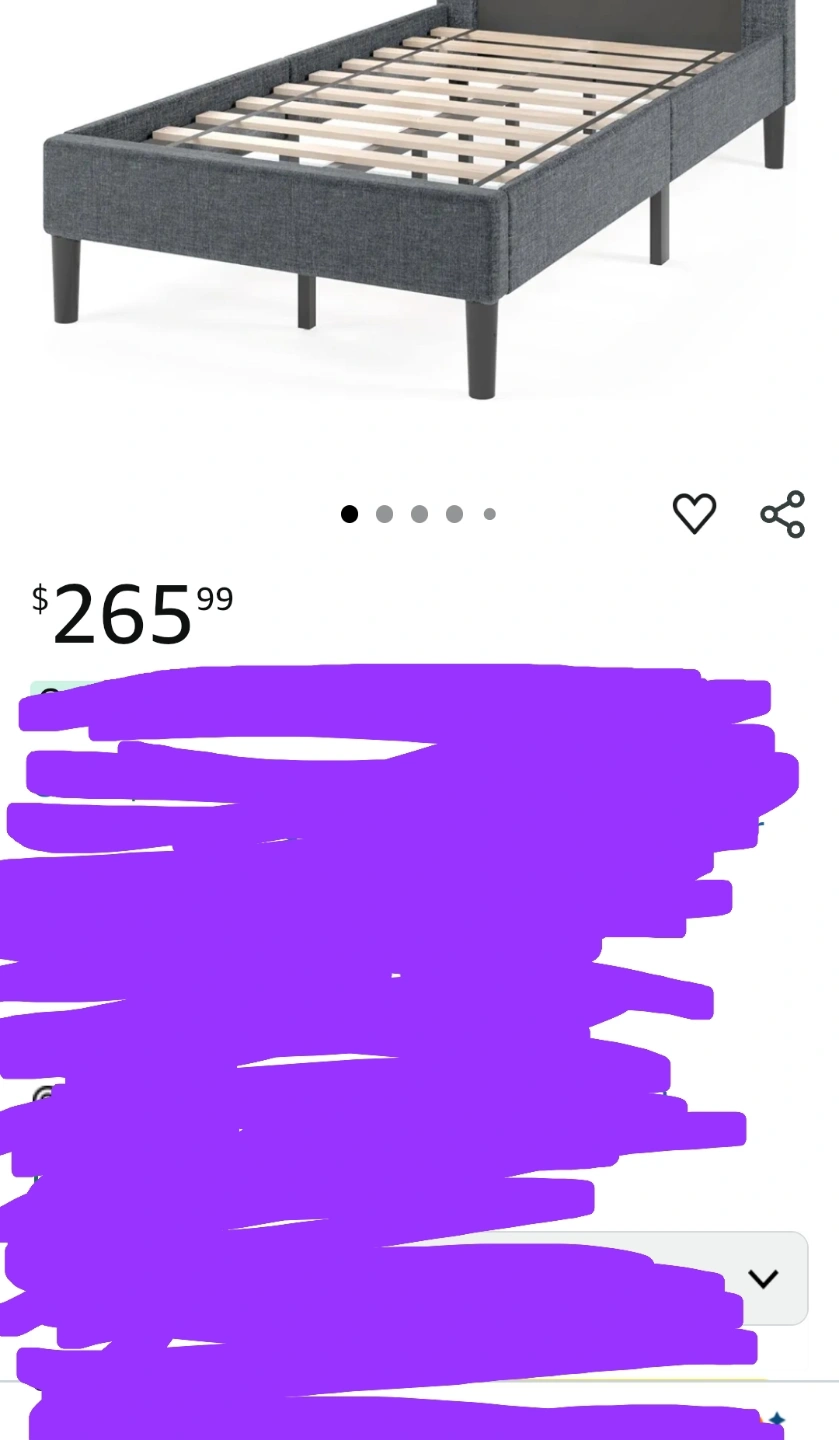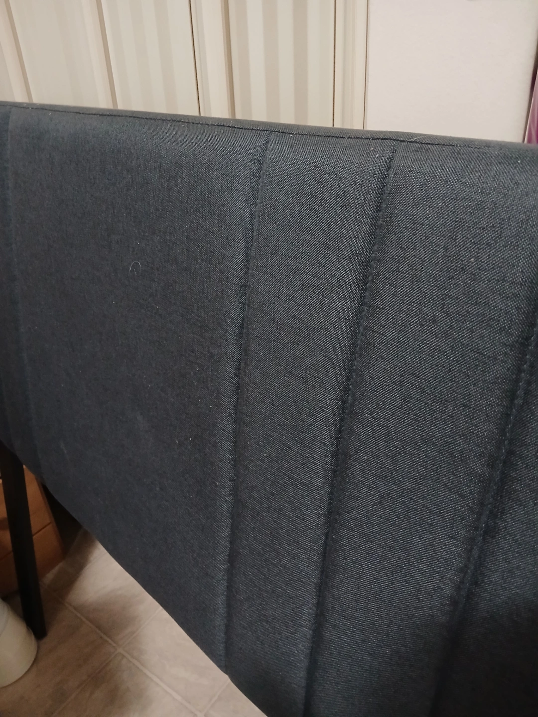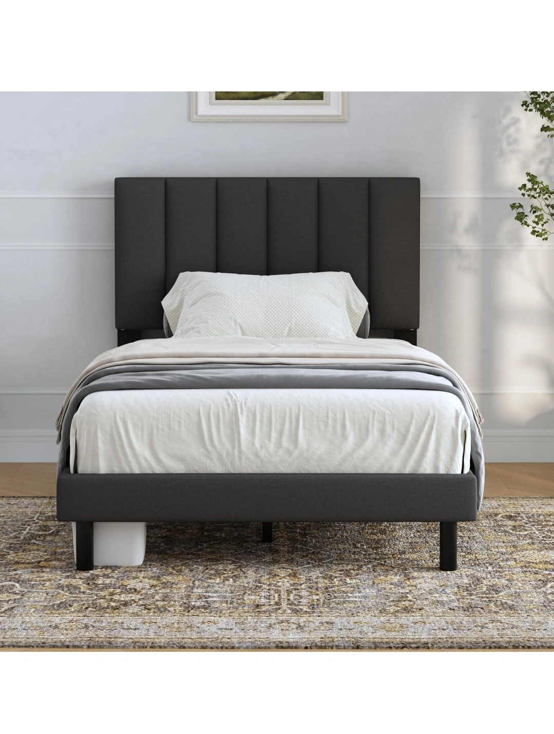 Dark grey fabric upholstered twin bed frame. Features a channel-tufted headboard and 7 inches of under-bed storage. Strong supportive legs. Easy to assemble.