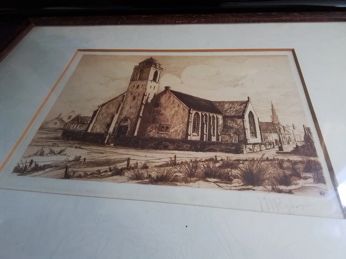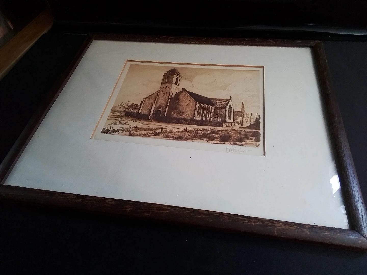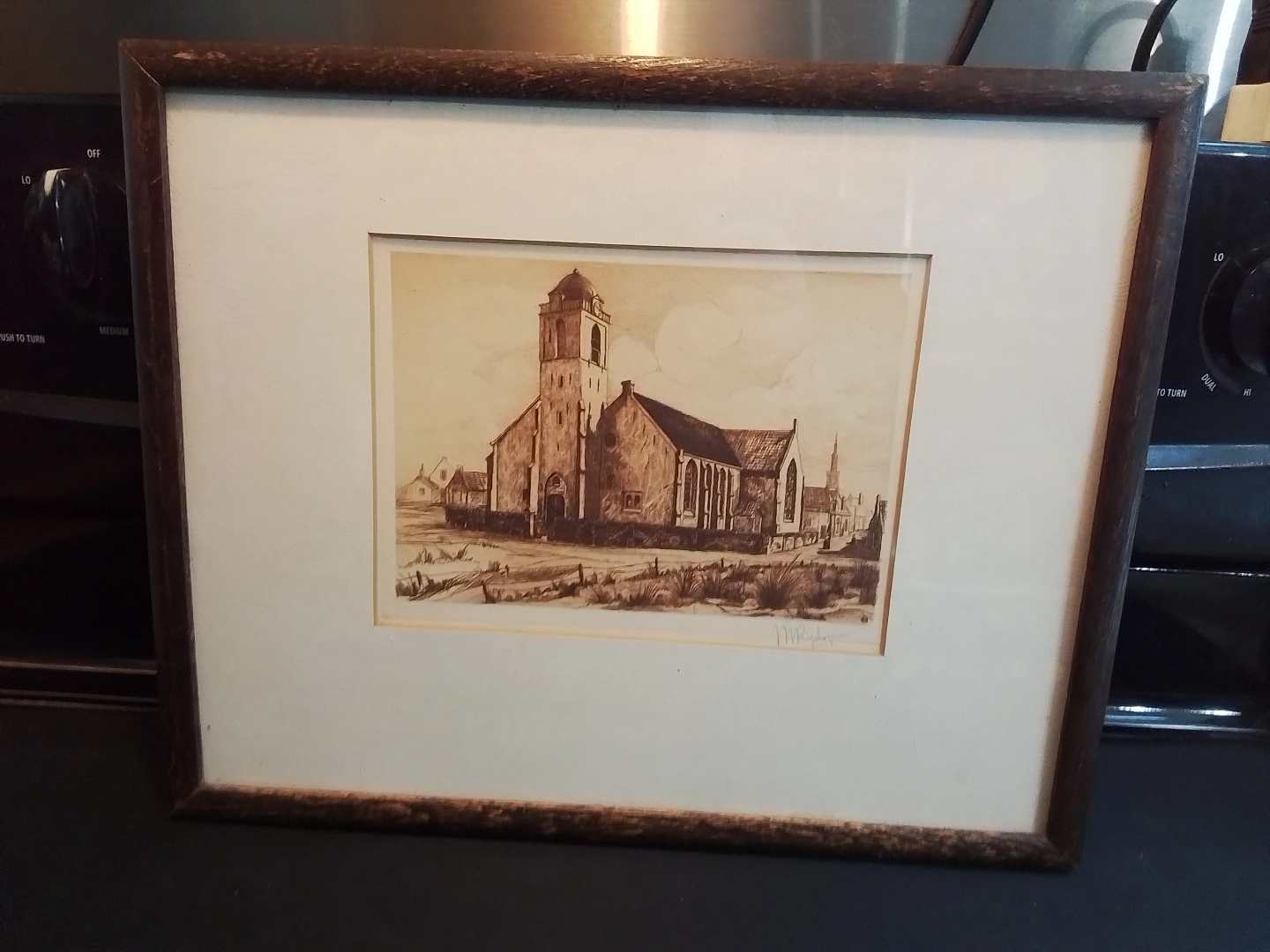 Dutch Etching on Paper Signed M. Riphagen Etching on paper, framed. This artwork depicts a detailed view of a historic church with a prominent tower, surrounded by smaller buildings and a landscape featuring vegetation and pathways. Rendered in sepia tones, the etching highlights intricate architectural details and a serene atmosphere. Signed M. Riphagen on lower right corner. 13 cm x 19 cm (5" x 7 1/2"), F: 29 cm x 37 cm (11 1/2" x 14 1/2") Estimate 300.00 - 500.00 USD Country of Origin: Netherlands This is a beautiful Dutch etching on paper, signed by M. Riphagen, depicting a serene architectural landscape. This used artwork carries a sense of history and character, perfect for adding a touch of vintage charm to your home. Its monochrome palette and detailed linework capture the essence of traditional Dutch art. It's like this piece has stories to tell from old Dutch masters, and now it’s ready to whisper them to you! Don't wait too long, or someone else might snatch up this slice of history. Just a heads-up, if the ad is up, it’s still available! Pickup at Young Street and Steels Ave