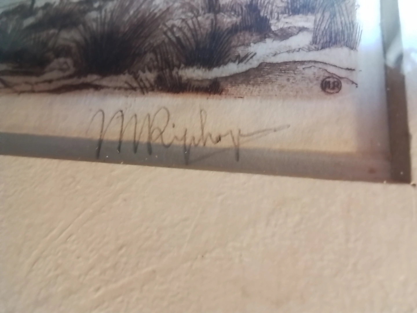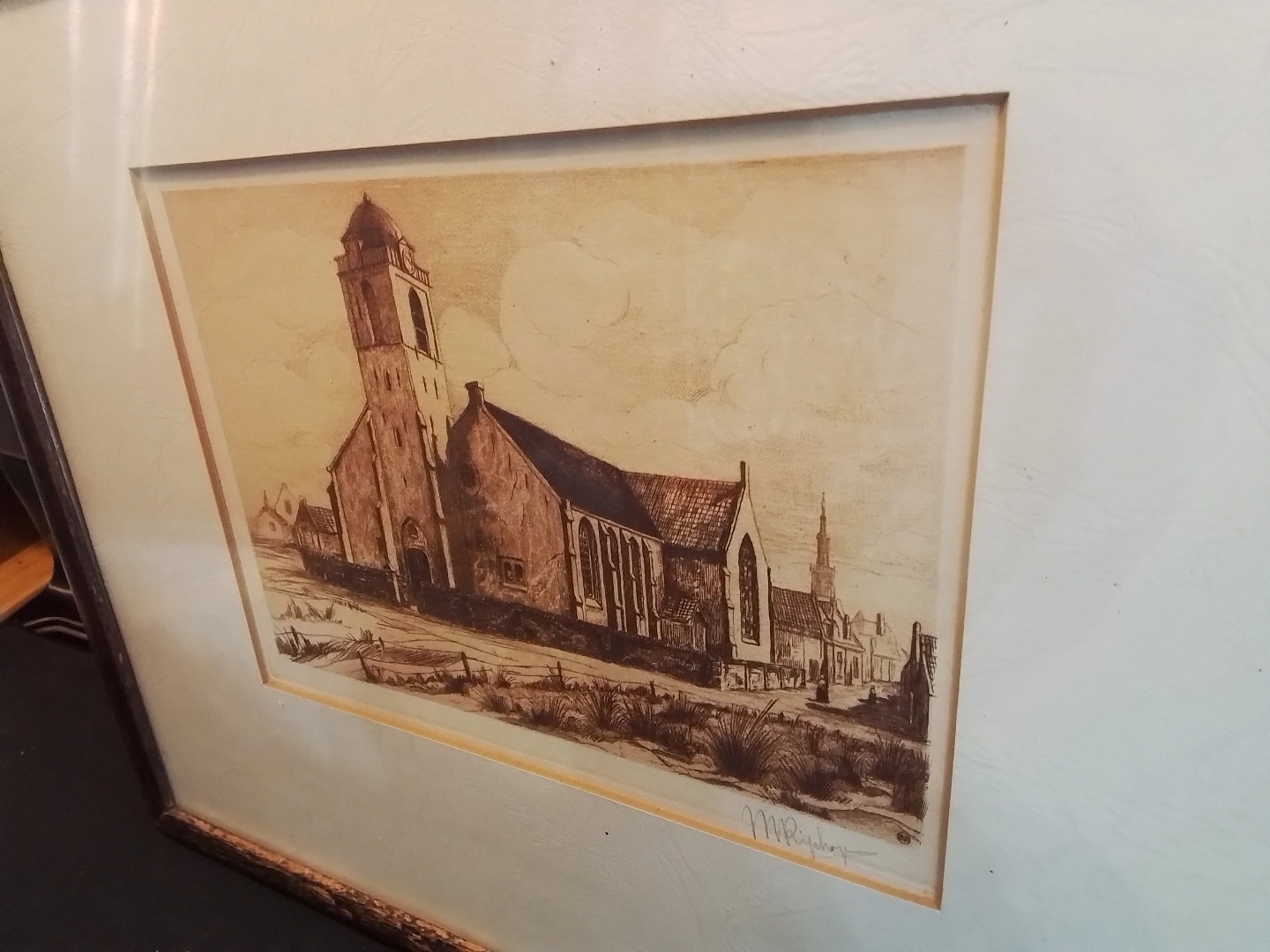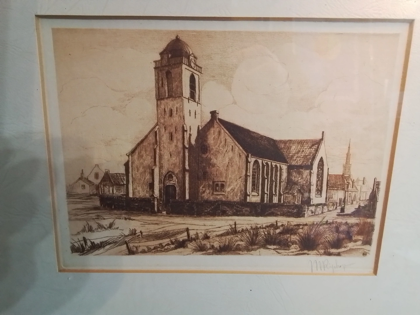 Dutch Etching on Paper Signed M. Riphagen Etching on paper, framed. This artwork depicts a detailed view of a historic church with a prominent tower, surrounded by smaller buildings and a landscape featuring vegetation and pathways. Rendered in sepia tones, the etching highlights intricate architectural details and a serene atmosphere. Signed M. Riphagen on lower right corner. 13 cm x 19 cm (5" x 7 1/2"), F: 29 cm x 37 cm (11 1/2" x 14 1/2") Estimate 300.00 - 500.00 USD Country of Origin: Netherlands This is a beautiful Dutch etching on paper, signed by M. Riphagen, depicting a serene architectural landscape. This used artwork carries a sense of history and character, perfect for adding a touch of vintage charm to your home. Its monochrome palette and detailed linework capture the essence of traditional Dutch art. It's like this piece has stories to tell from old Dutch masters, and now it’s ready to whisper them to you! Don't wait too long, or someone else might snatch up this slice of history. Just a heads-up, if the ad is up, it’s still available! Pickup at Young Street and Steels Ave