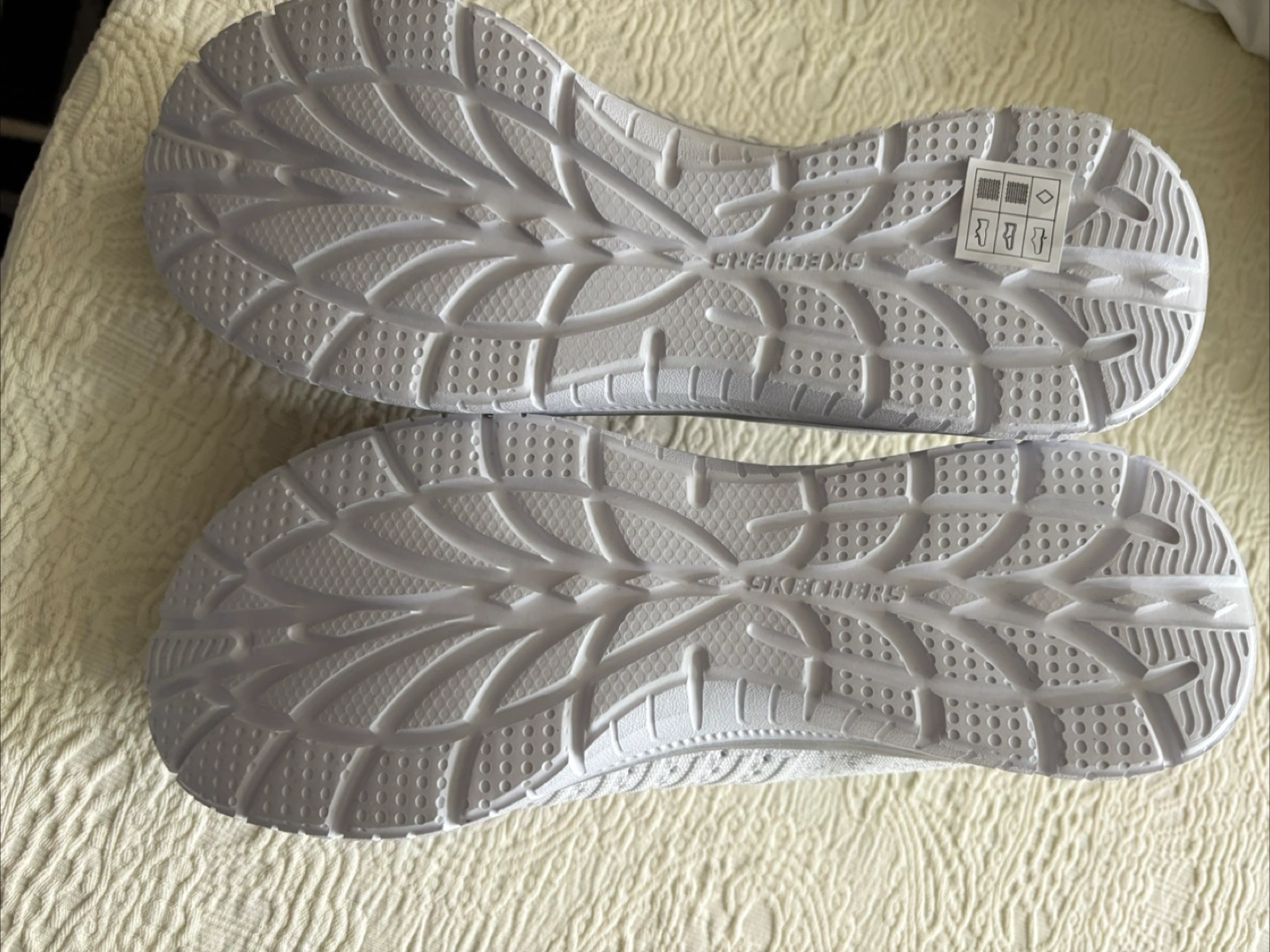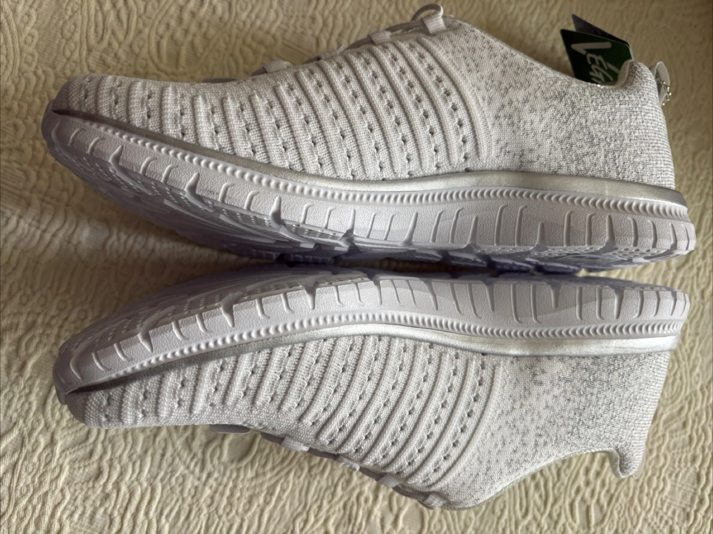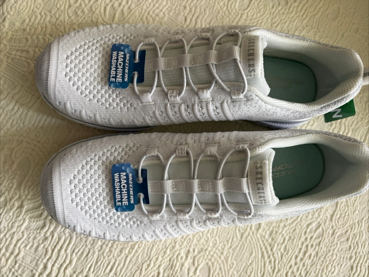 New women's Skechers walking shoes. Machine washable. White knit upper. Memory Foam insole. Lightweight and comfortable.
