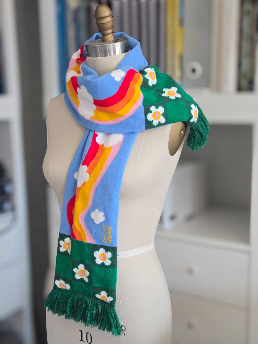 💞🌹Cute and colourful knit daydream scarf by Artist Colette, worn once like new. Features rainbow, clouds, and flowers.Fringe at the bottom. Cozy and warm.✨️🌈
