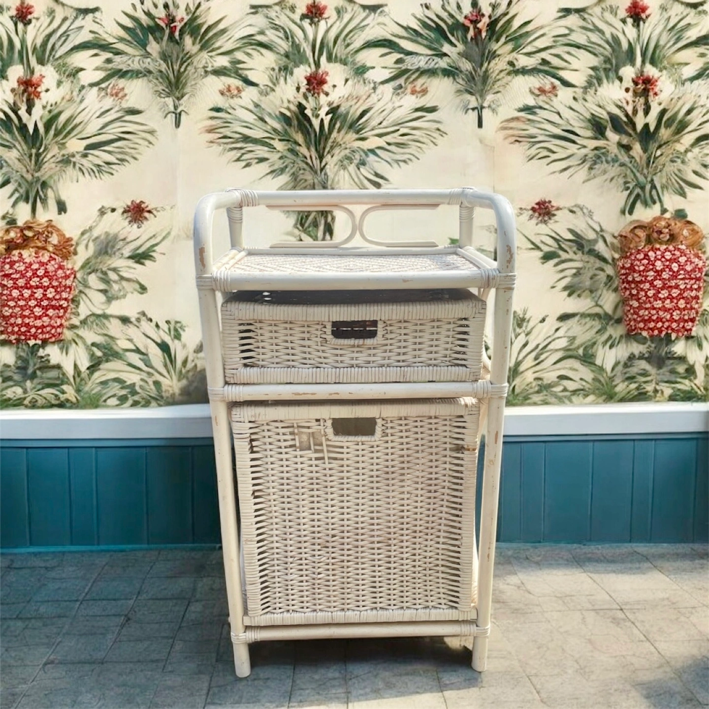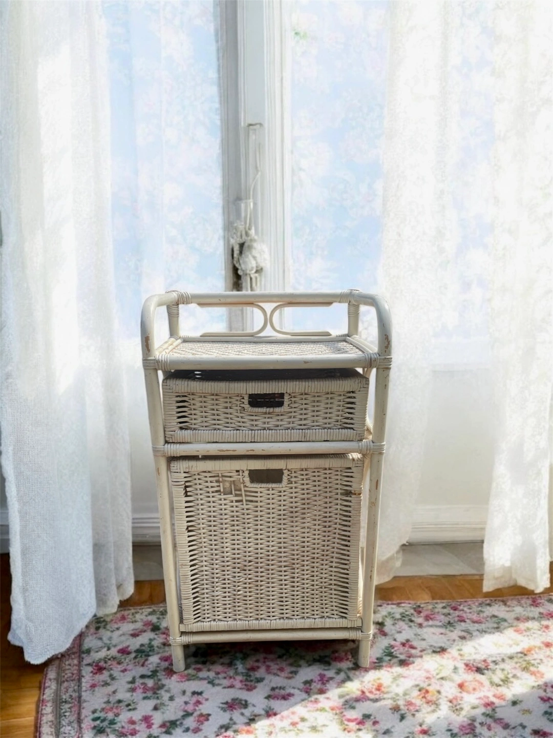 Piece is dated to 70/80s. Perfect for laundry, linens, or as a decorative storage piece. Could also be a night stand etc…or general storage unit. Adds a touch of boho, coastal, or french cottagecore charm to any room.
