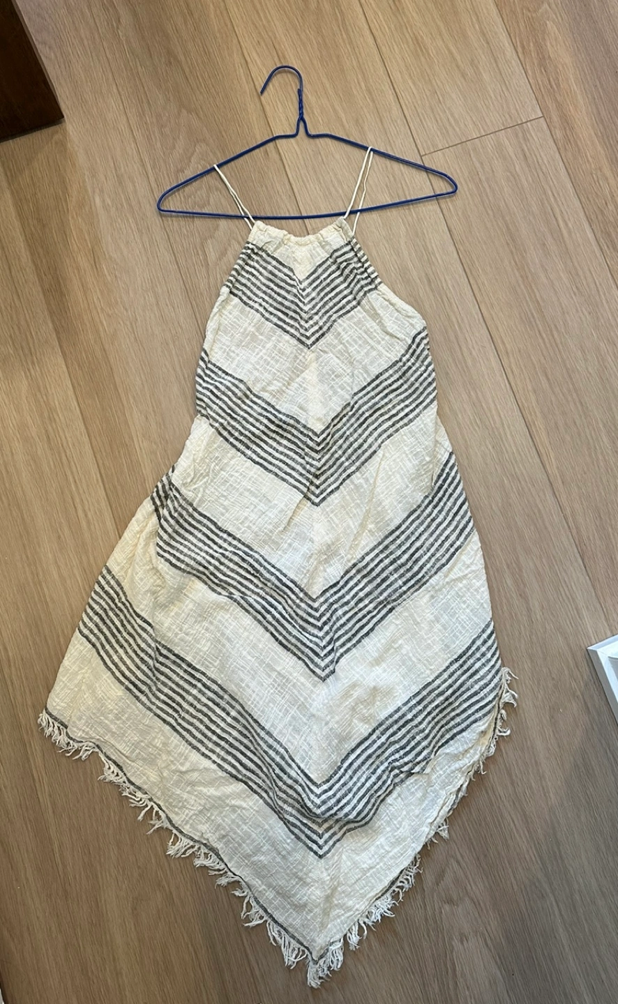 66Striped mini dress. Size extra small. Features a halter neck and frayed edges. Lightweight material.