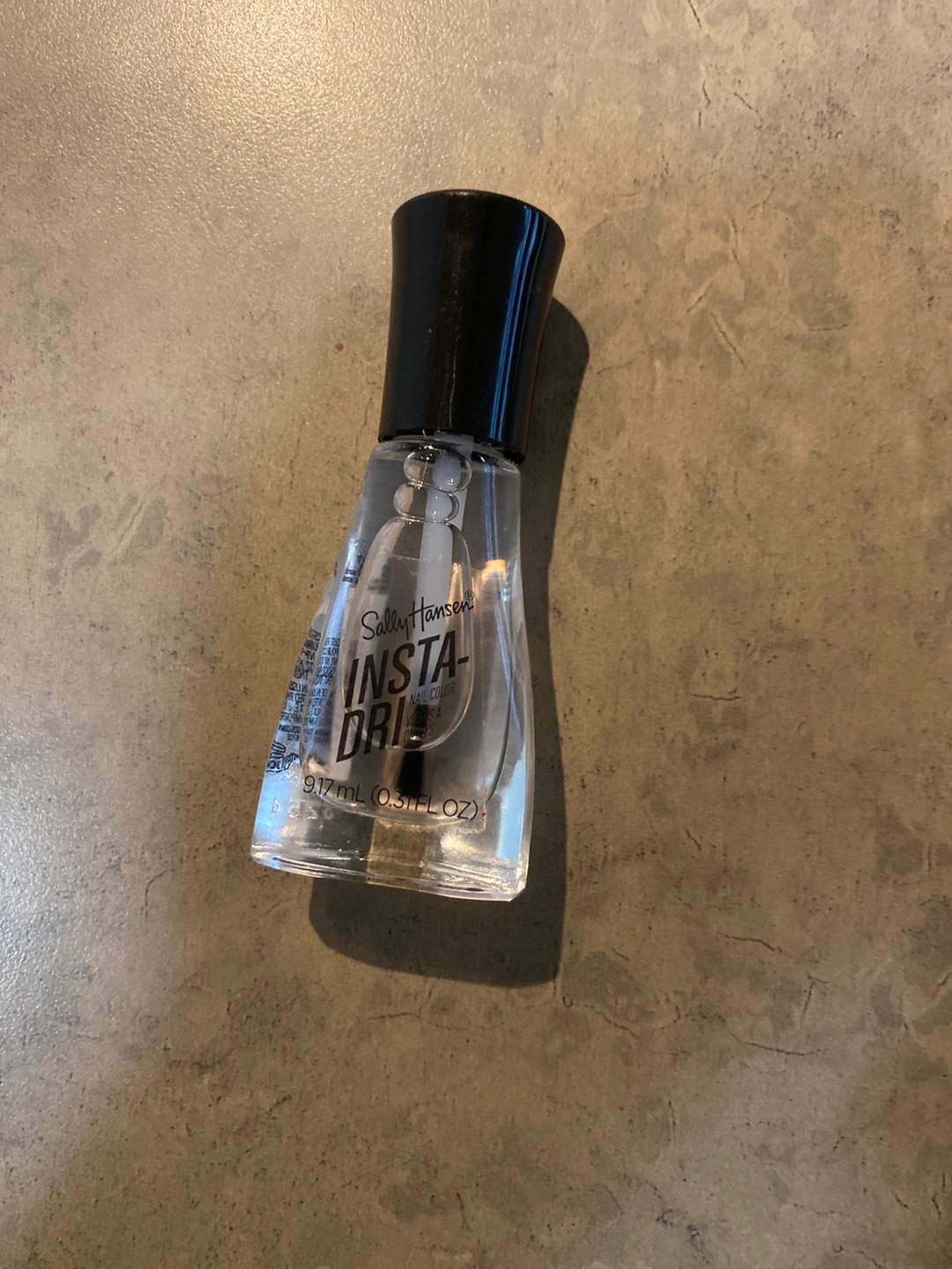 Sally Hansen Insta-Dri top coat. Clear bottle, black cap. Small size, perfect for travel.