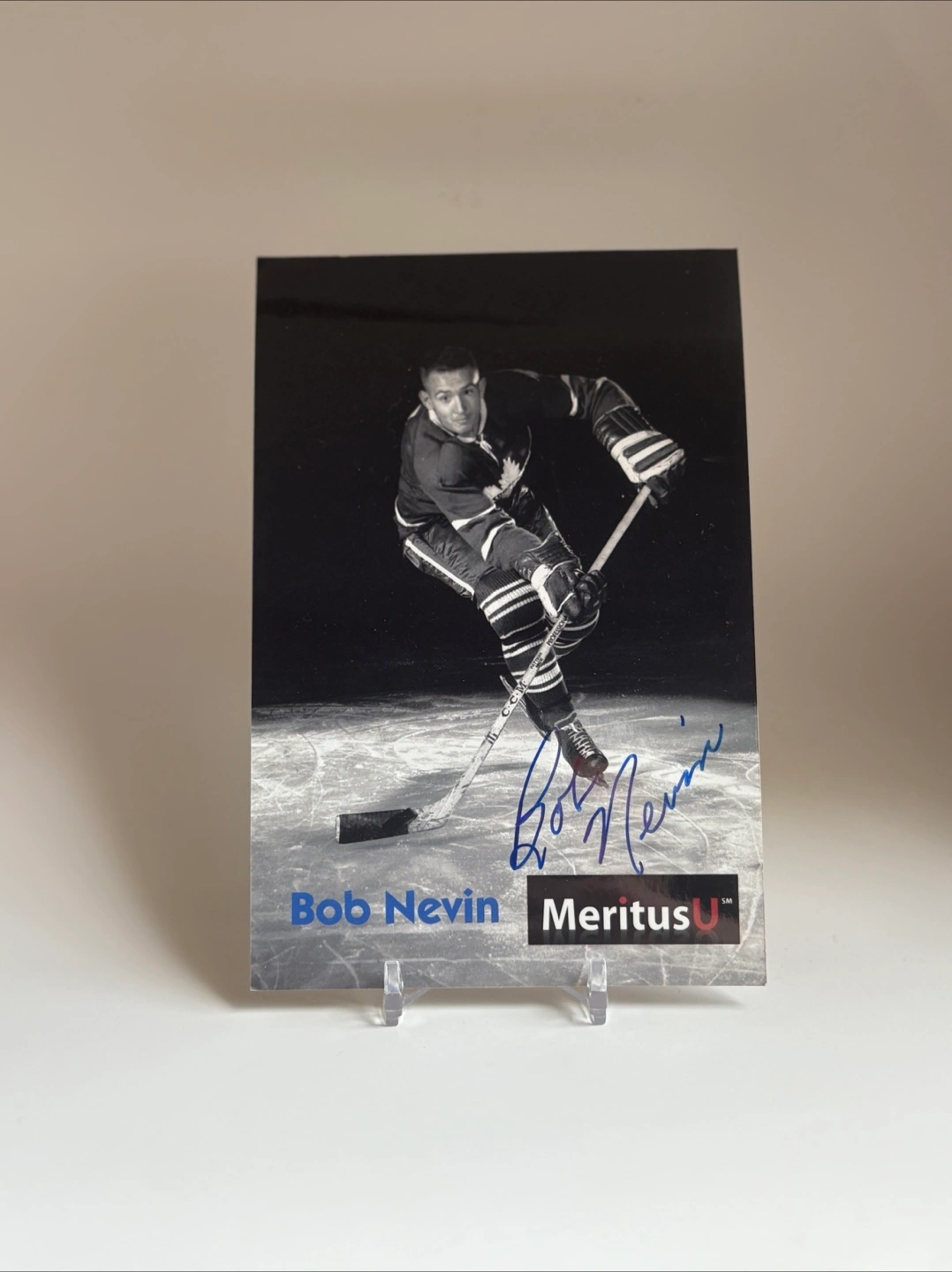 127Collectible hockey photograph featuring Bob Nevin's signature. Black and white photo. Meritus U branding.