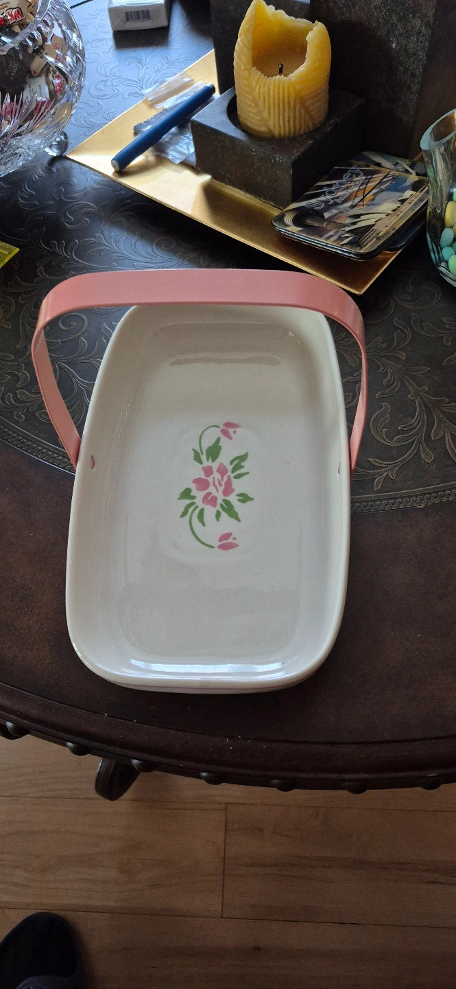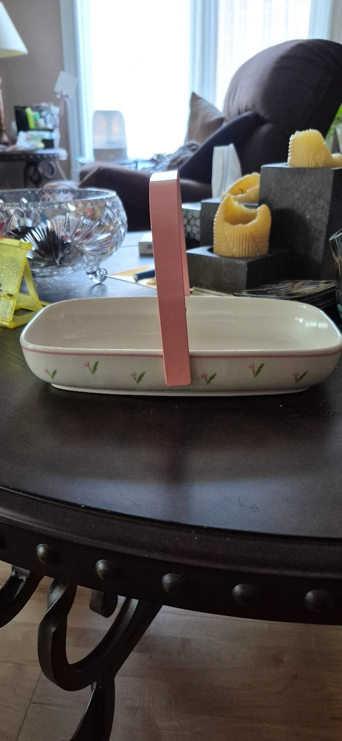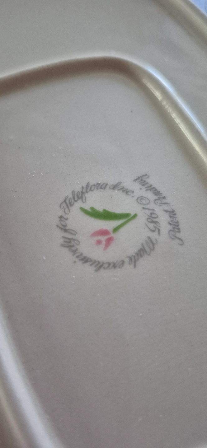 Adorable vintage 1985 teleflora ceramic serving tray. Features a pink steel handle and floral designs. Add a touch of retro elegance to your table. Perfect for bread, snacks, or other small items. Made exclusively for Teleflora 1985. Patent pending. never used, collecting dust. looking for a new home.