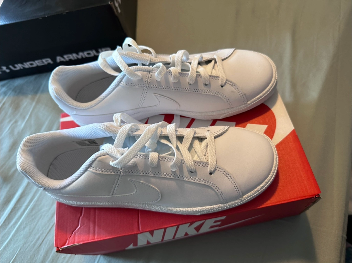 Pair of new Nike Court Royale 2 sneakers. All white leather. Classic style. Great for everyday wear. Comes in original box.