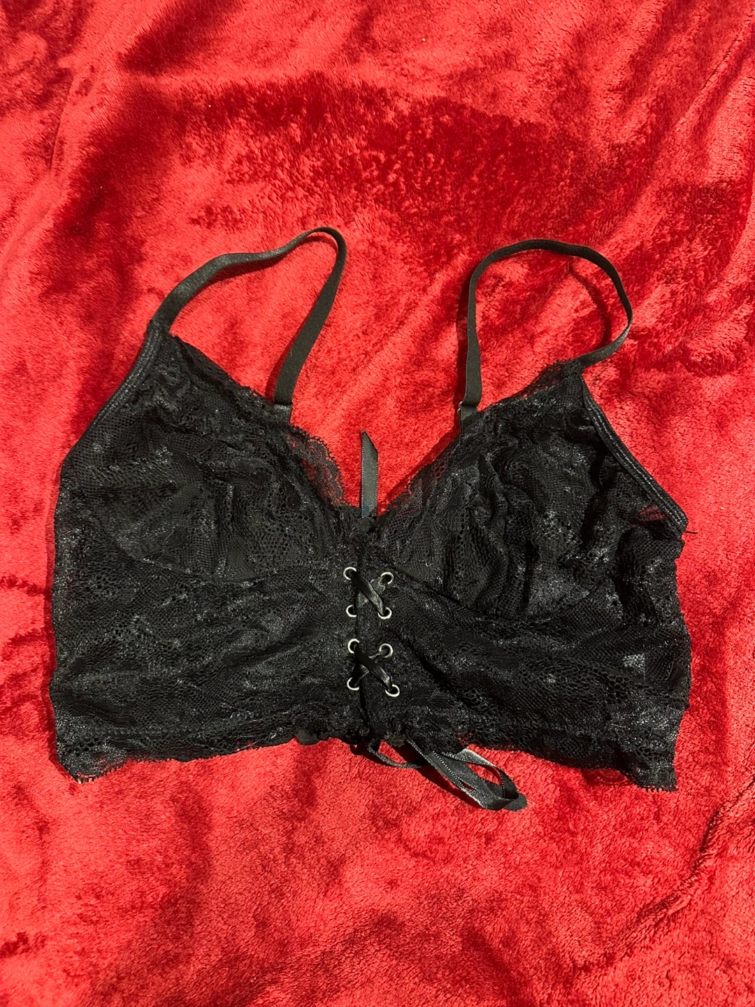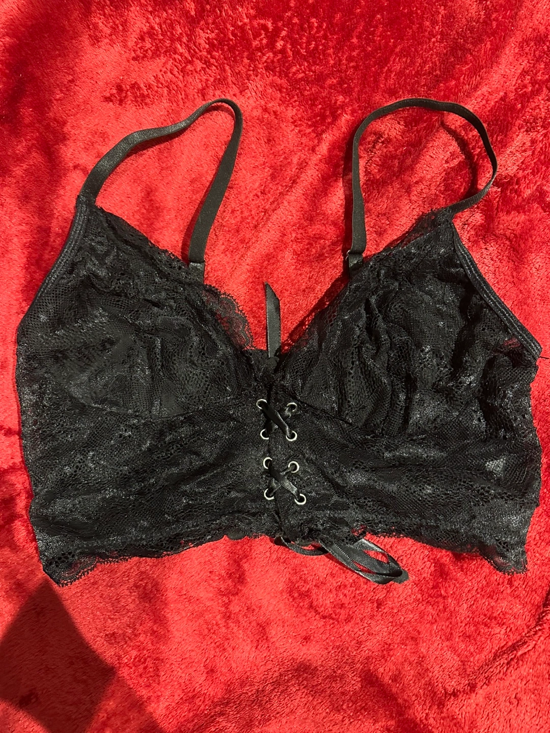 Stunning black lace bralette. Features a corset-style lacing detail at the centre. Adjustable straps. Delicate and feminine.