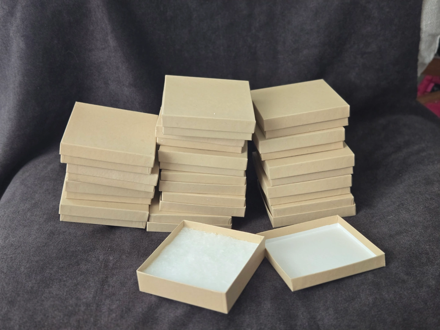 Set of around 16 boxes ideal for jewellery or small gifts. Size is 4" x 4" & 1" depth . Kraft paper colour & white padded inserts included. Perfect for small businesses or gifts! 😊