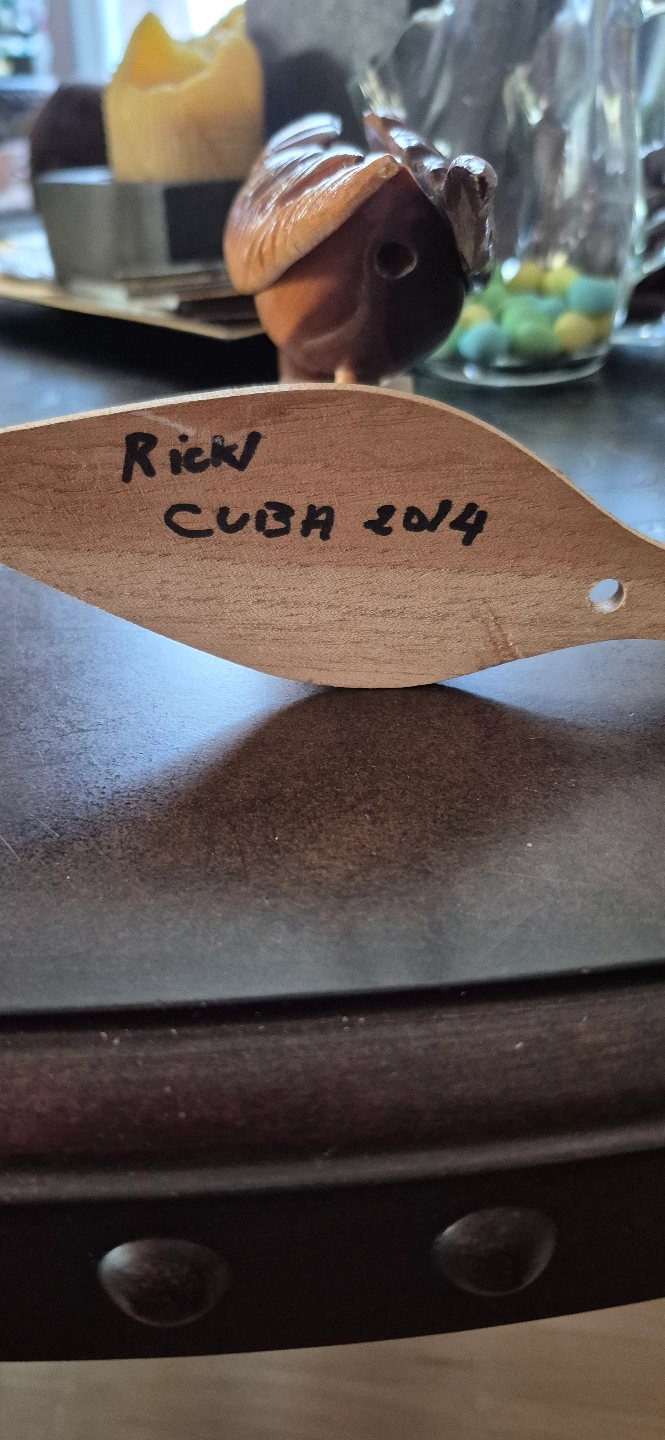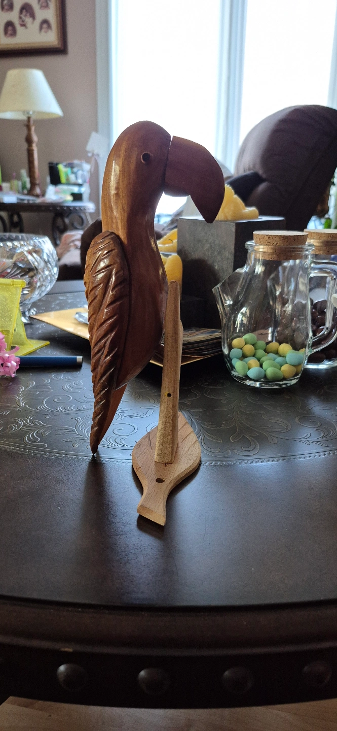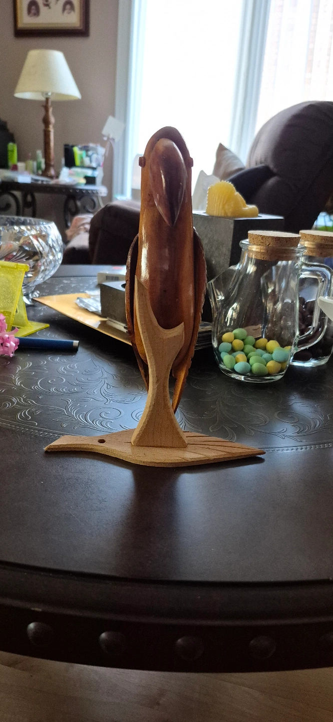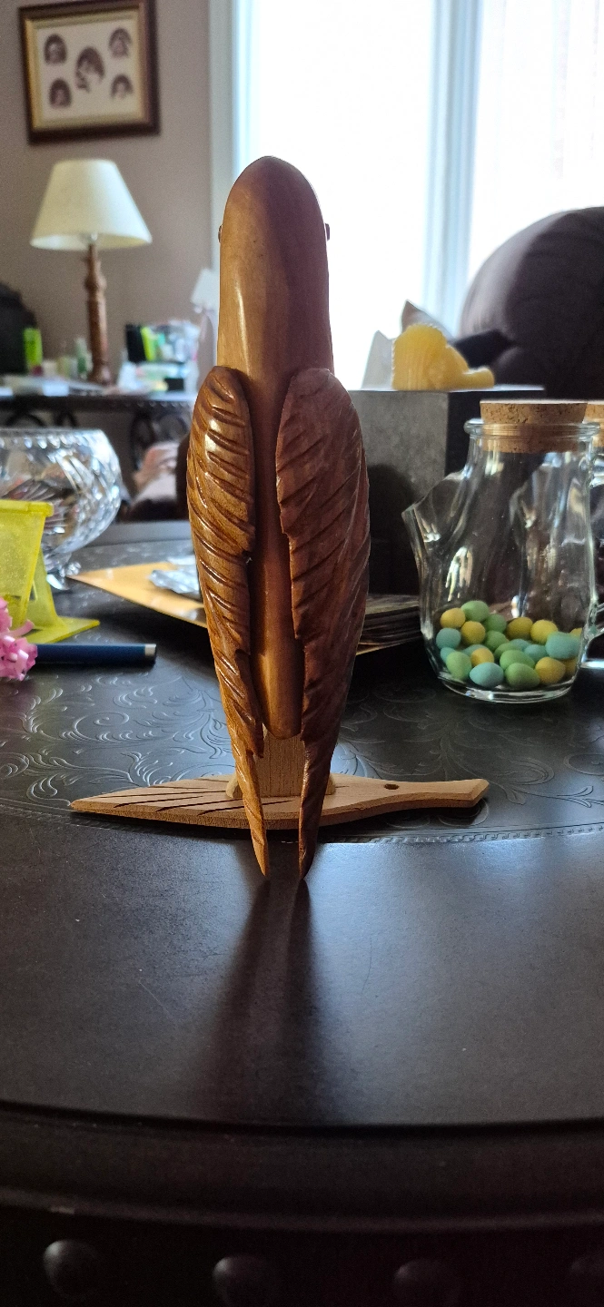 Unique wooden parrot carving. Intricate details. Artist signature on stand. Beautiful addition to any collection.