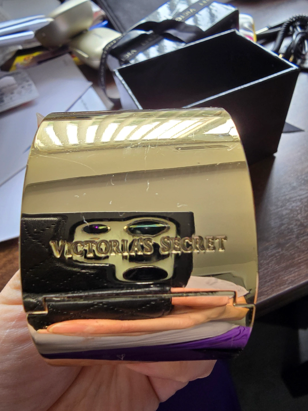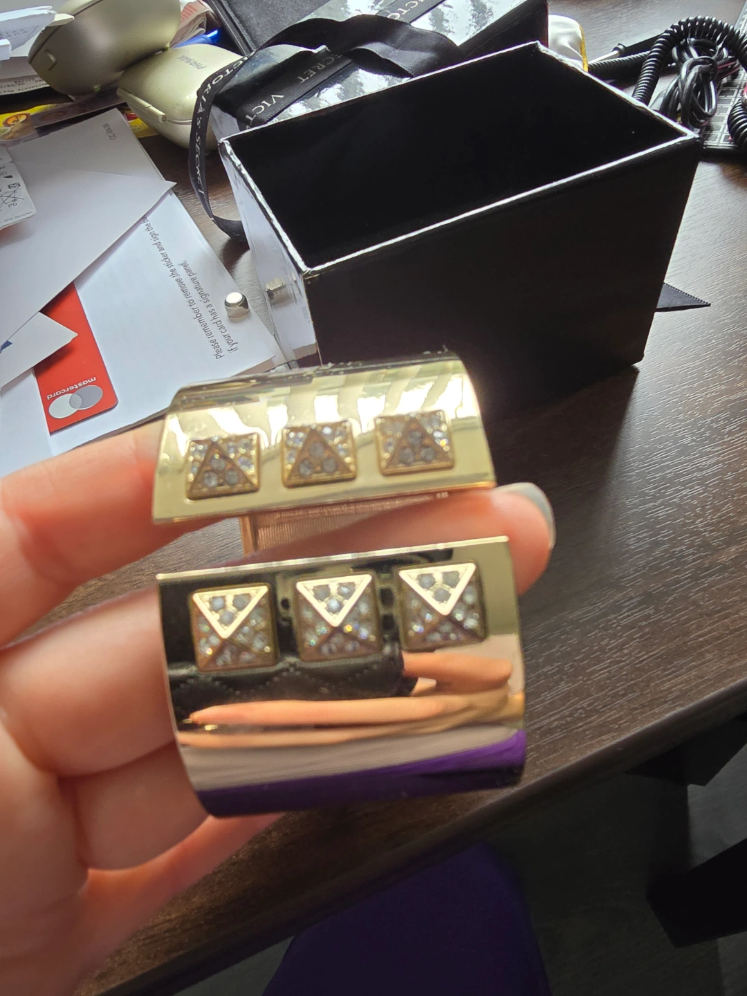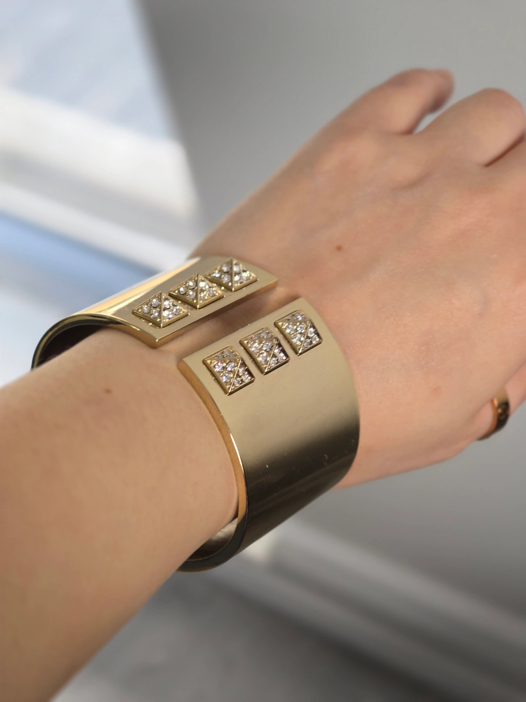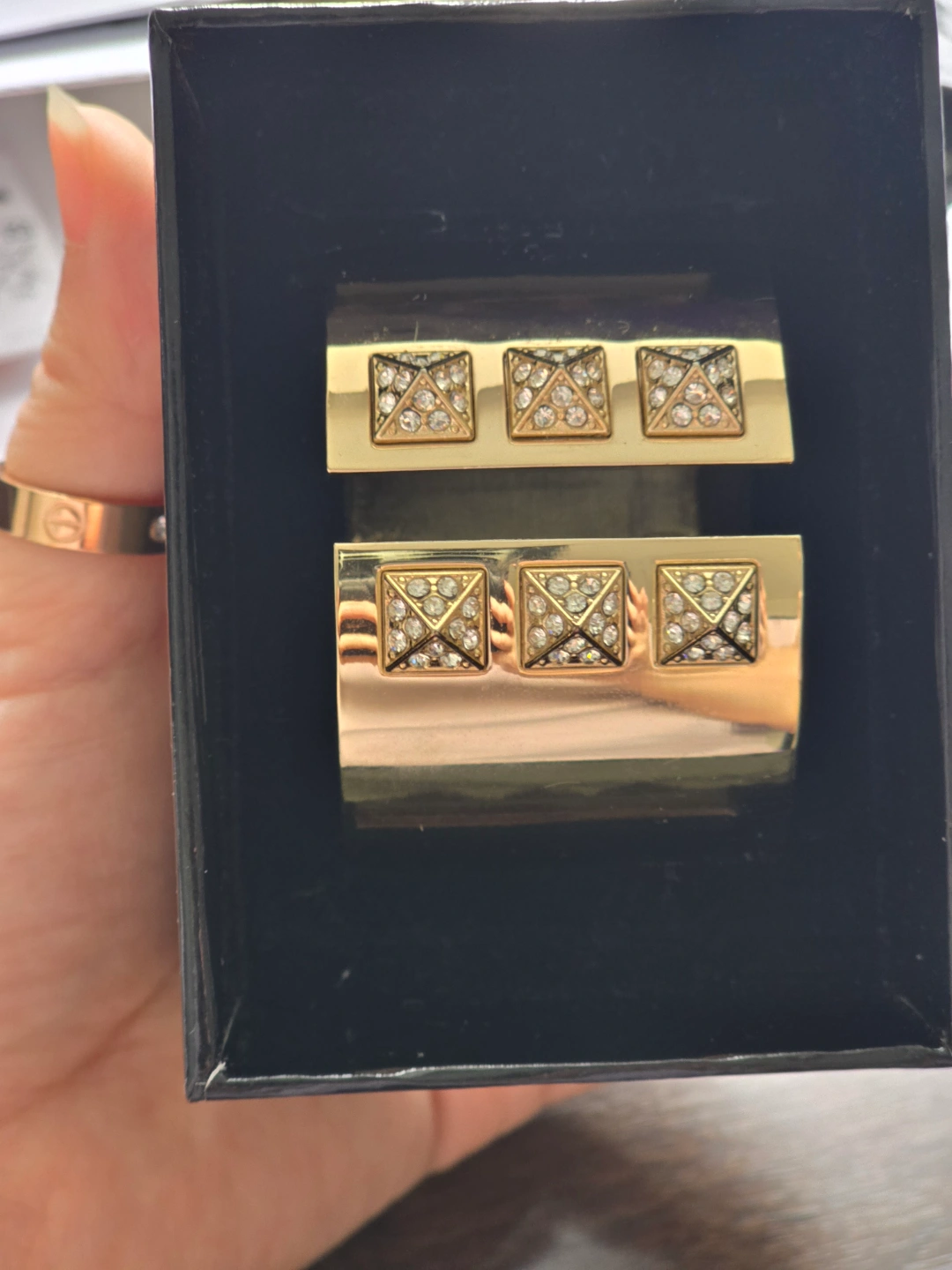 Gold-tone metal cuff bracelet. Features clear rhinestone accents. Comes with original box. Excellent condition.