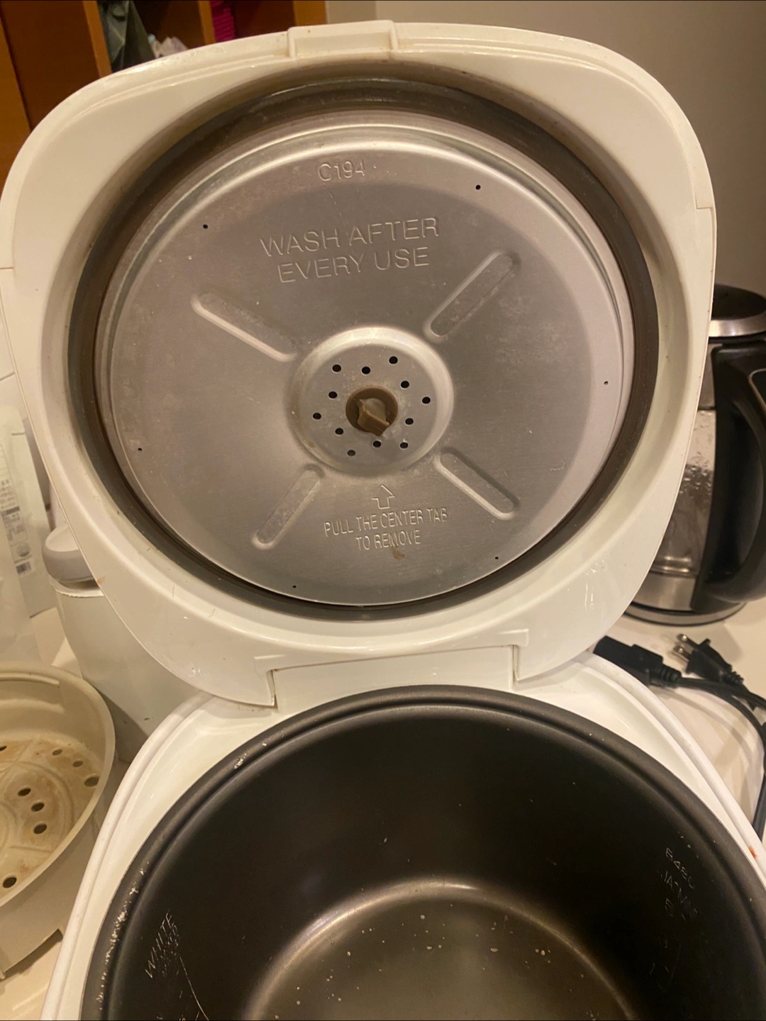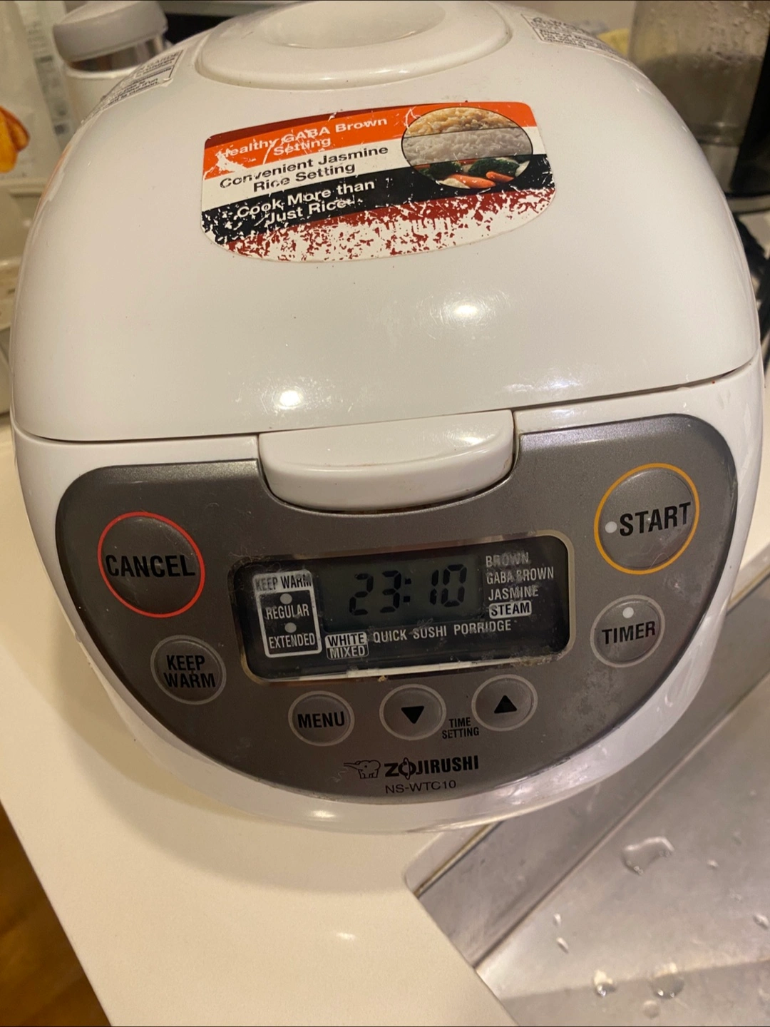 Used Zojirushi rice cooker. Up to 5.5 cups. Cooks white, brown, jasmine, mixed, quick, sushi, and porridge rice. Keep warm function. Digital controls. Includes inner cooking pot and steaming basket. Convenient delay timer.