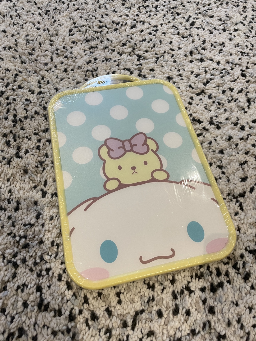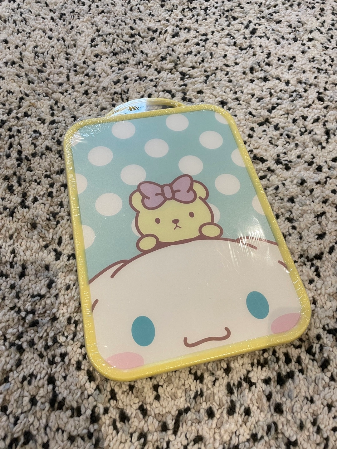 Cute and functional cutting board. Features a pastel design with polka dots and Sanrio characters. Perfect for small kitchens or children.