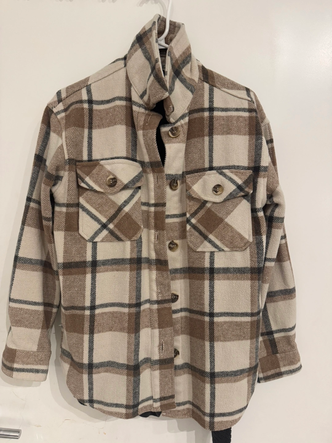 Oversized flannel shirt jacket. Brown, beige and black plaid pattern. Long sleeves, button closure, and two chest pockets.