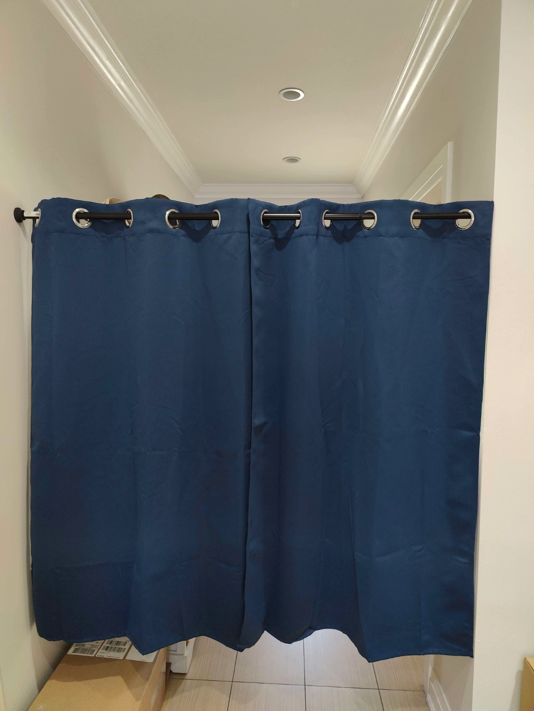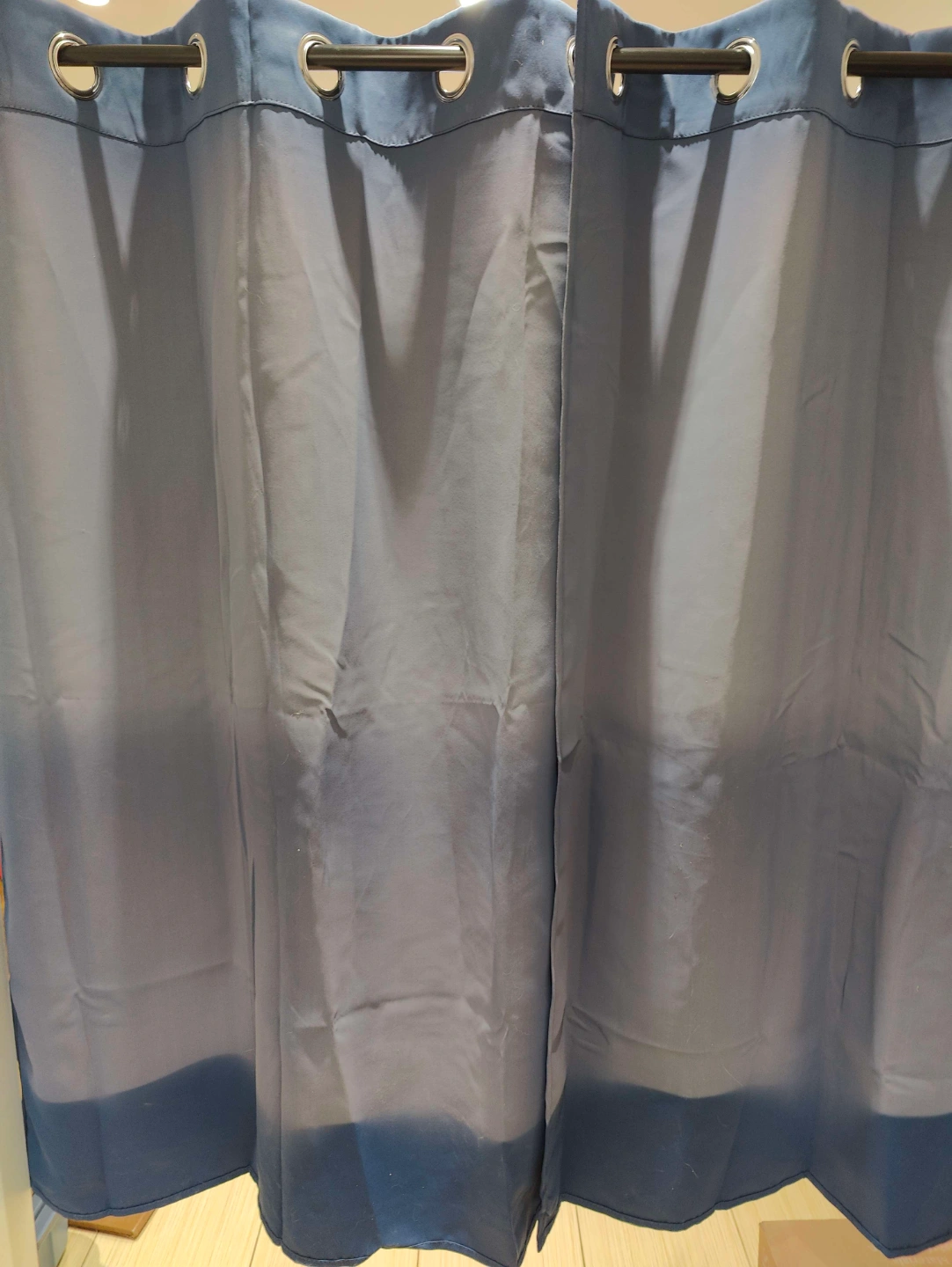 Pair of dark blue blackout curtains, each panel measures 38x54 inches. Please note that the back of the curtains is sun faded. Ikea tension rod included in price. Pick up only, closest intersection is College and Lansdowne