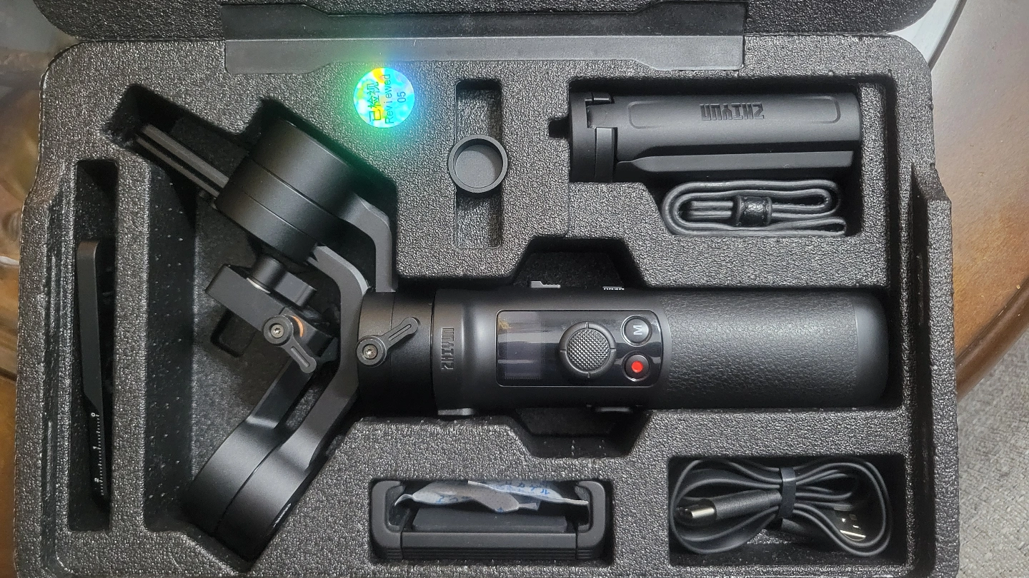 Three-axis gimbal stabilizer. Foldable design. Includes carrying case and accessories. Good for smartphone videography.