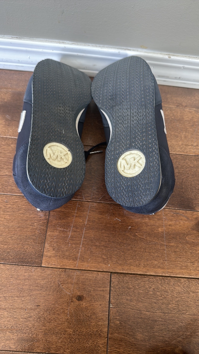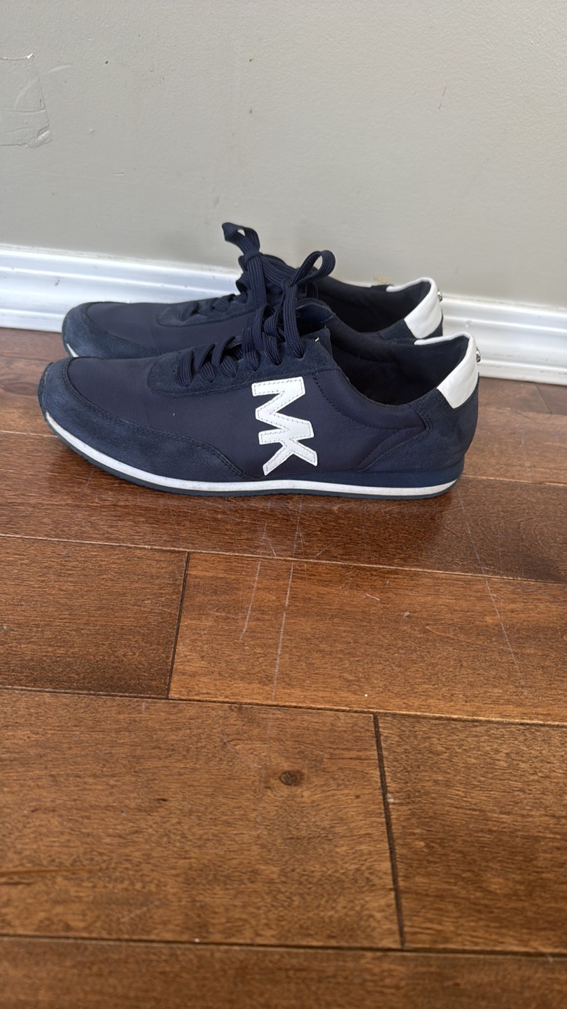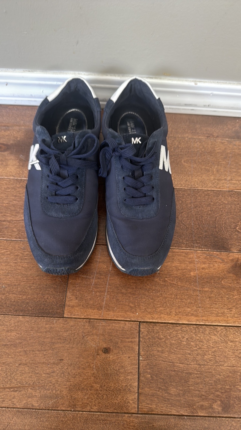 Michael Kors Stanton sneakers in navy blue with white accents. The sneakers feature a lace-up design, a round-toe silhouette, and the signature "MK" logo on the side. They have a suede and textile upper, a textile lining, and a rubber sole. The heel measures approximately 0.5 inches.