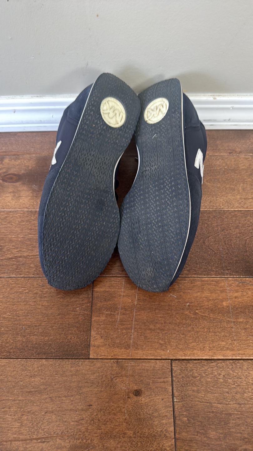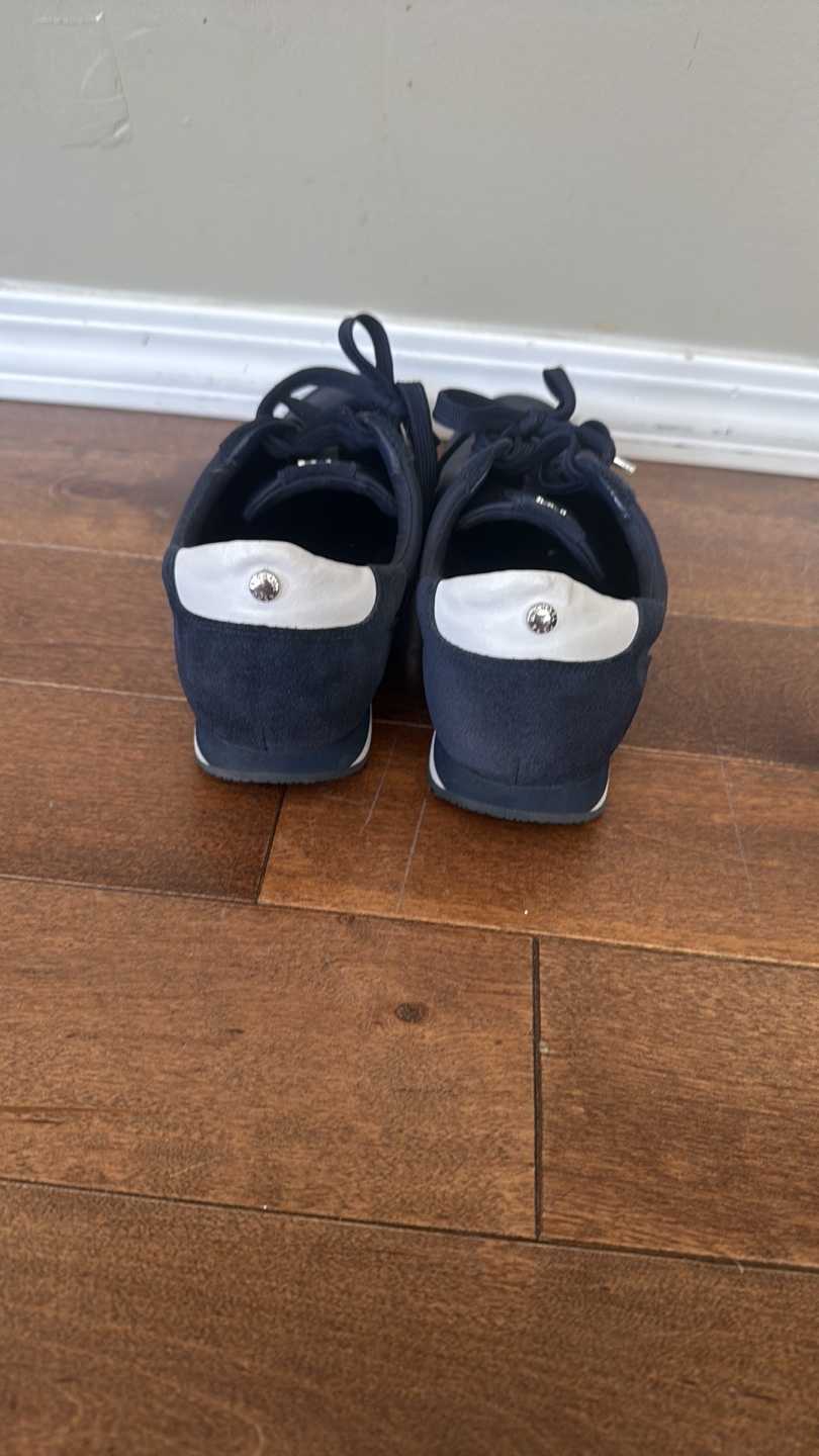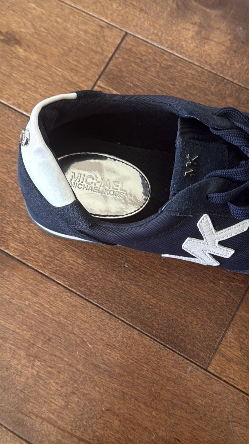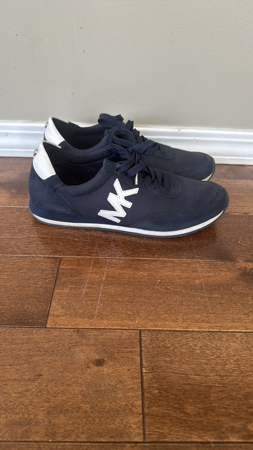 Michael Kors Stanton sneakers in navy blue with white accents. The sneakers feature a lace-up design, a round-toe silhouette, and the signature "MK" logo on the side. They have a suede and textile upper, a textile lining, and a rubber sole. The heel measures approximately 0.5 inches.
