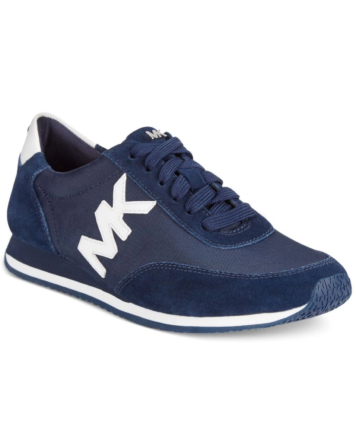 Michael Kors Stanton sneakers in navy blue with white accents. The sneakers feature a lace-up design, a round-toe silhouette, and the signature "MK" logo on the side. They have a suede and textile upper, a textile lining, and a rubber sole. The heel measures approximately 0.5 inches.