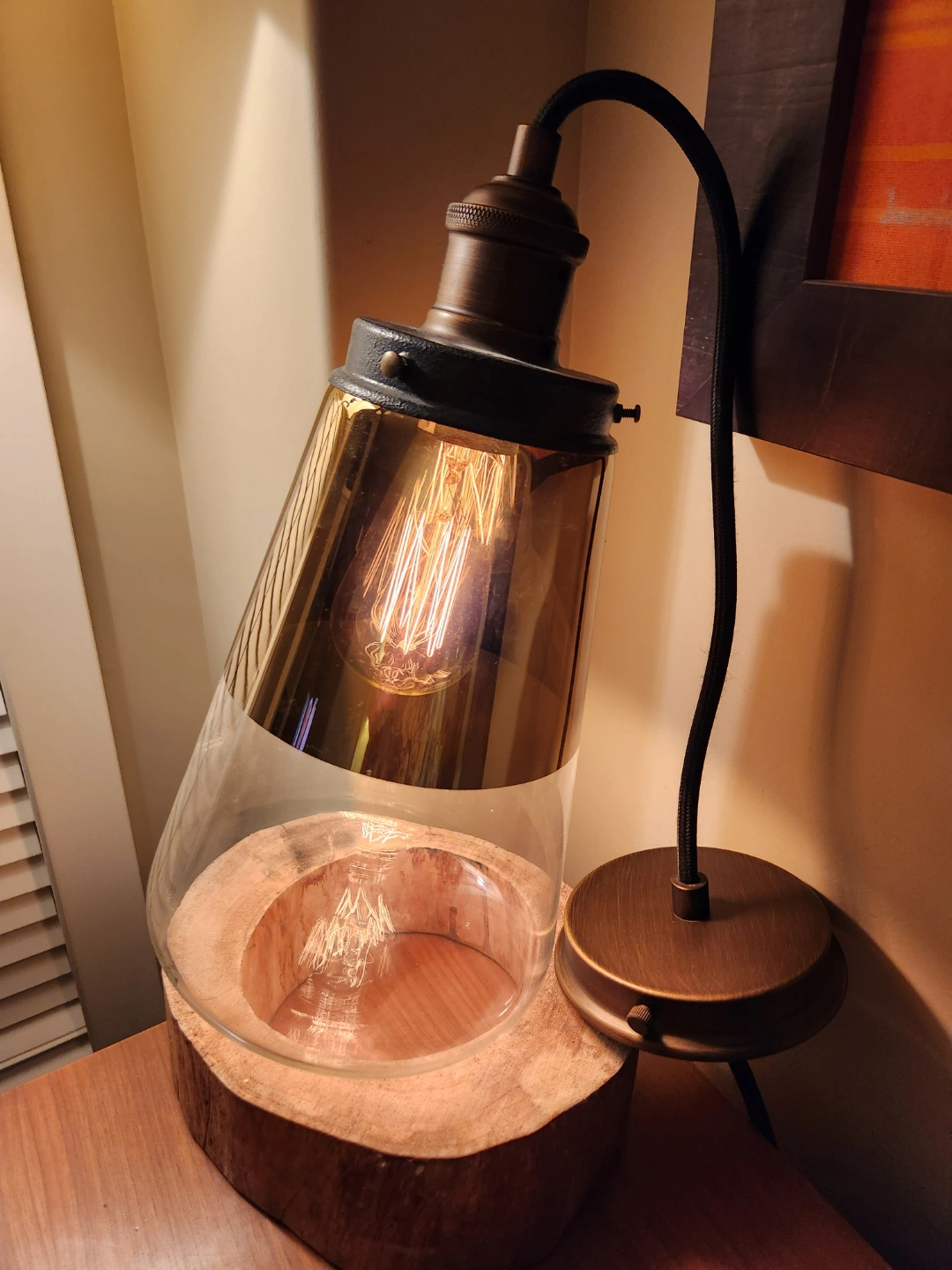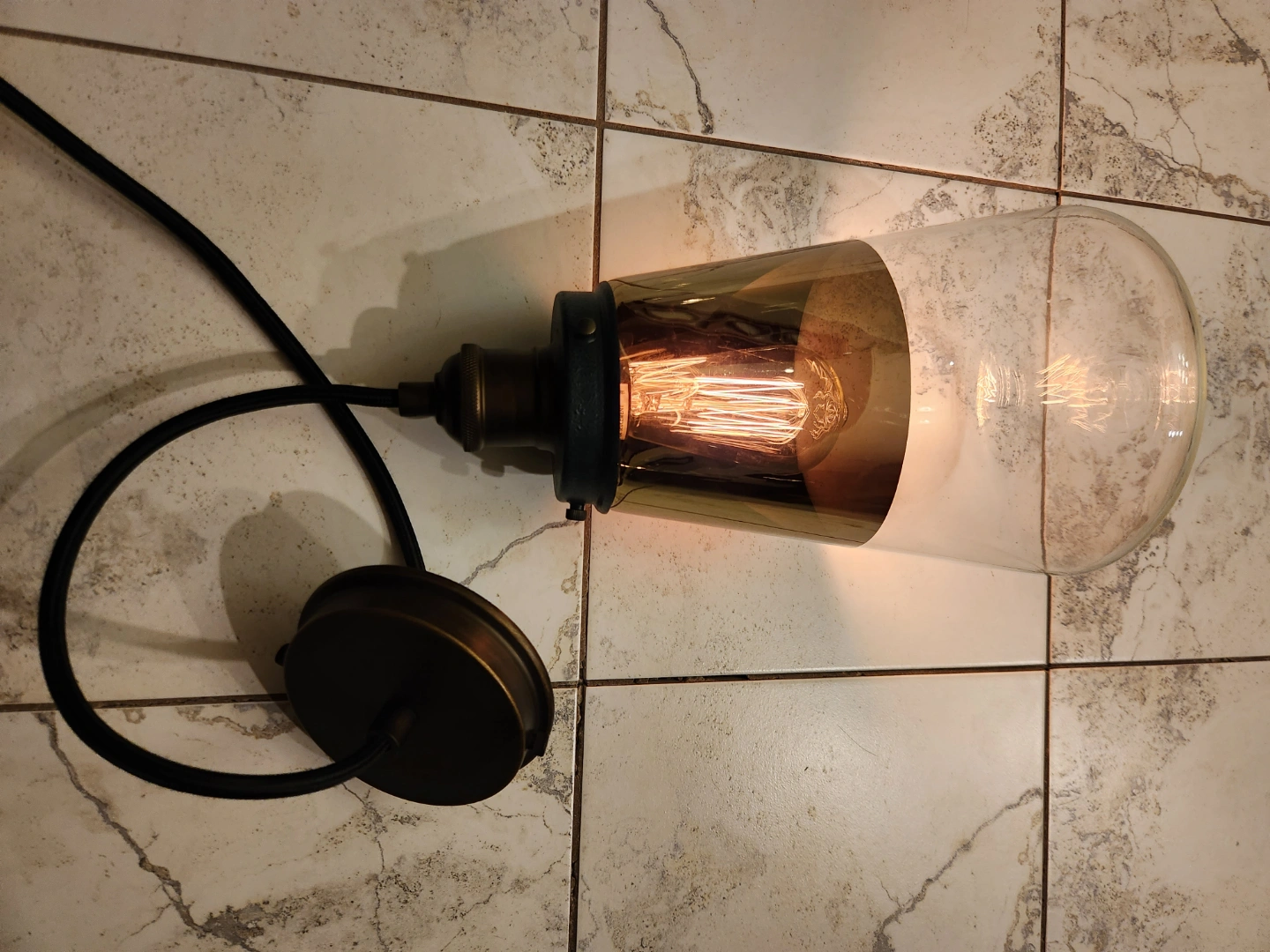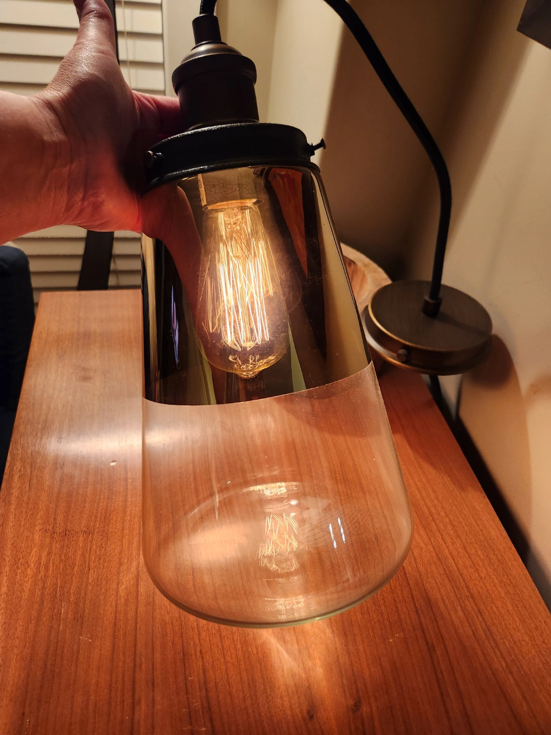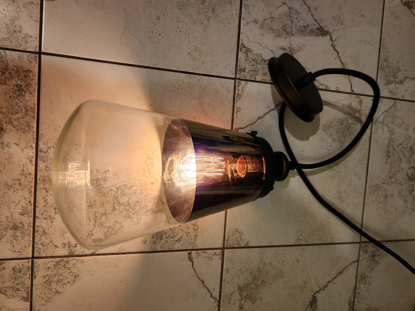Unique mcm style light fixture Features a glass shade, and exposed any featured light bulb. Industrial design. Great for adding character to any space.