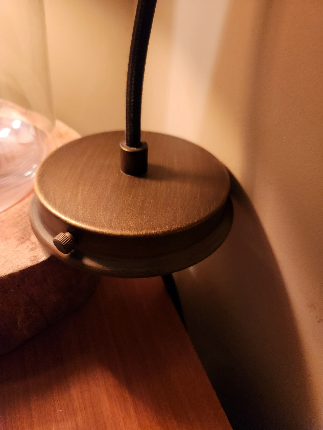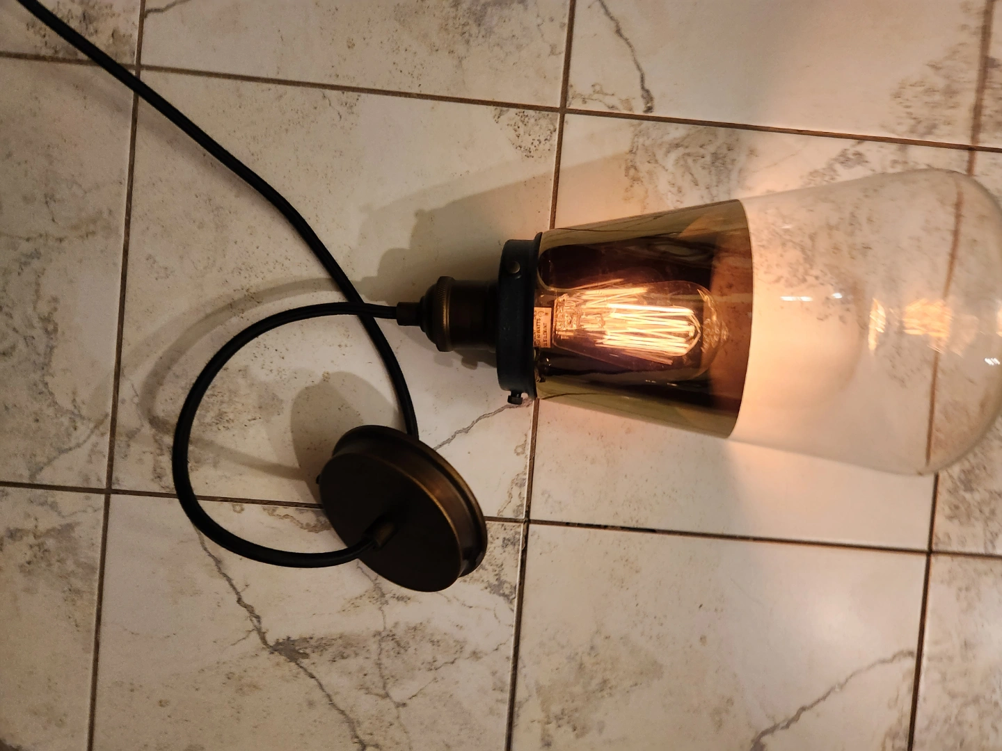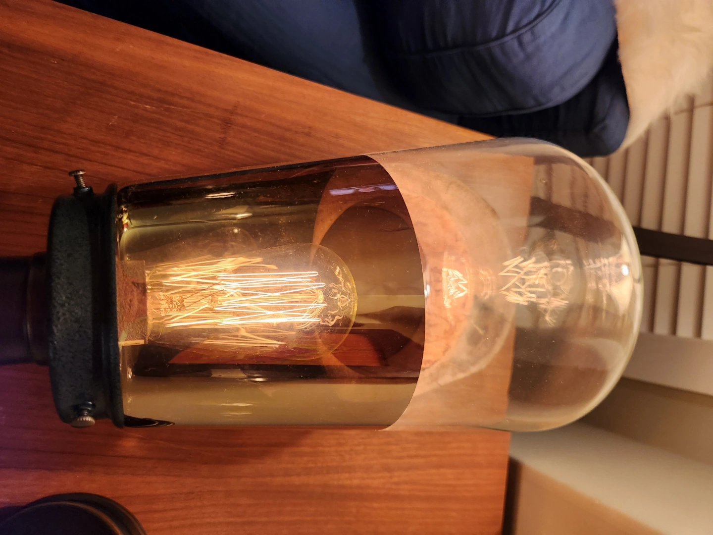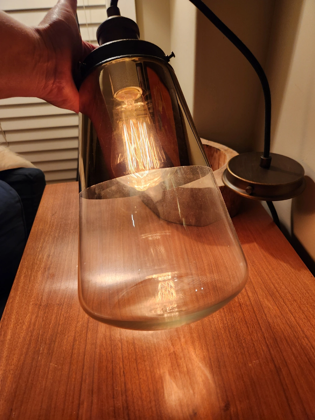 Unique mcm style light fixture Features a glass shade, and exposed any featured light bulb. Industrial design. Great for adding character to any space.