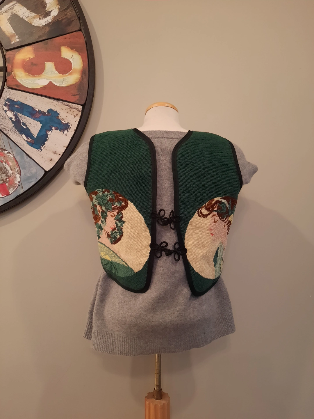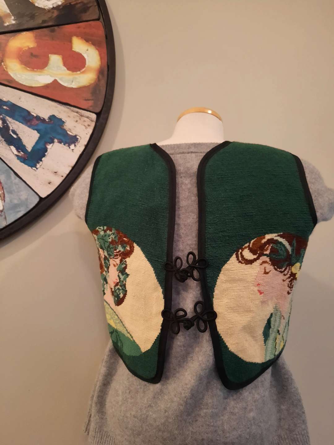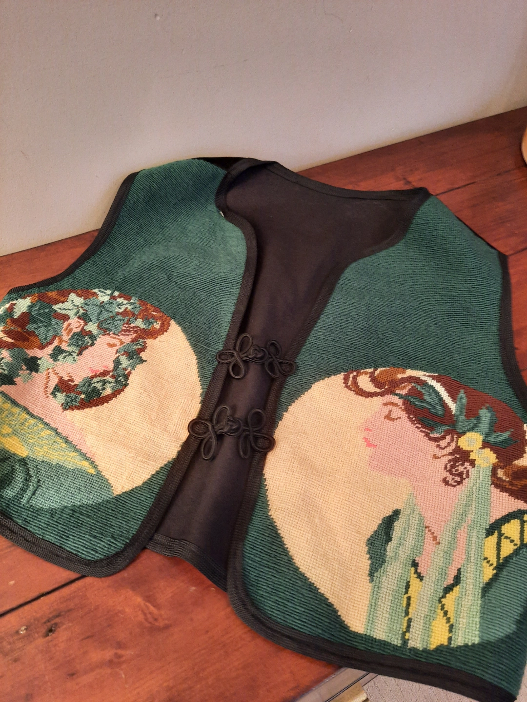 Unique vintage vest. Features a beautiful needlepoint design taken from famous artist. ALFONSE MUCHA. 2 women faces framed by ivy on both sides. Dark green backroynd with Black fabric trim. Unique bohemian-style closure. Get festival ready with this summertime overvest! size extra small to small.