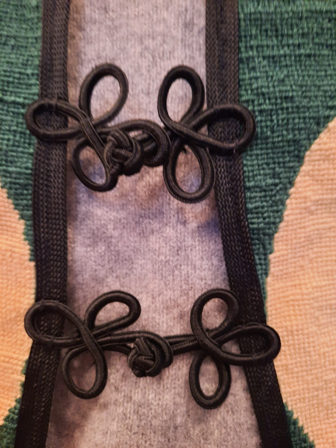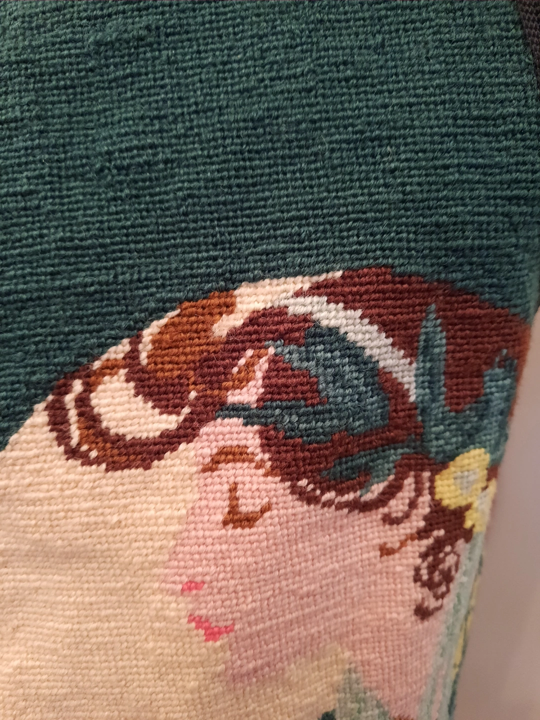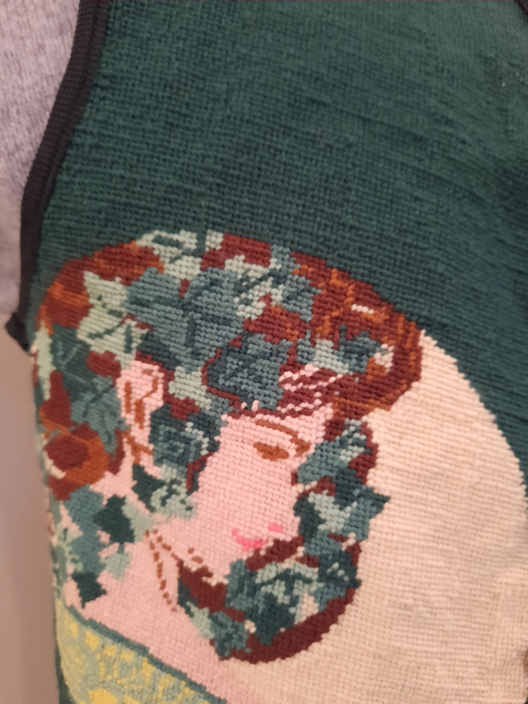 Unique vintage vest. Features a beautiful needlepoint design taken from famous artist. ALFONSE MUCHA. 2 women faces framed by ivy on both sides. Dark green backroynd with Black fabric trim. Unique bohemian-style closure. Get festival ready with this summertime overvest! size extra small to small.