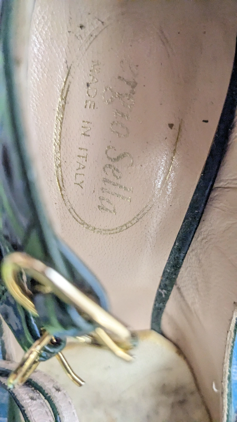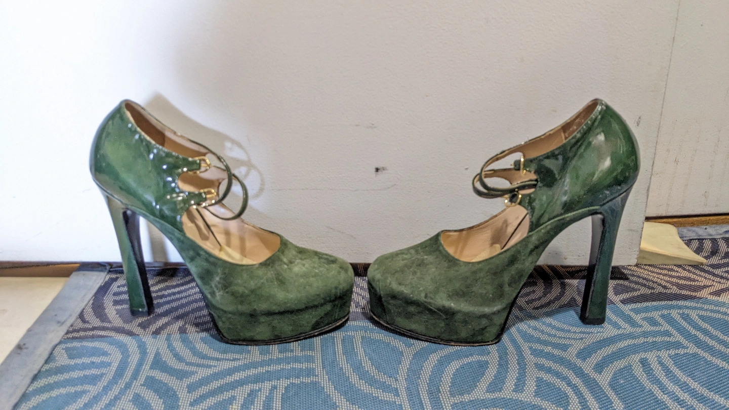 Gorgeous dark green platform heels. Suede and genuine Italian leather.. High stiletto heel. Ankle strap with gold buckle. Made in Italy.