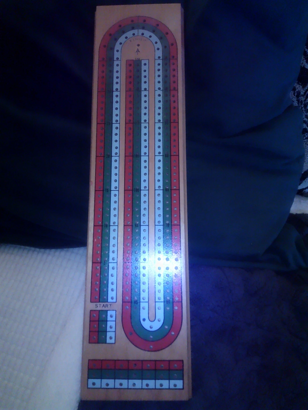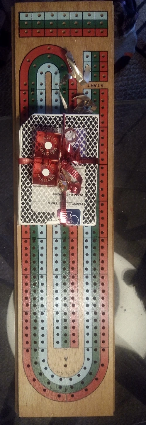 137Classic cribbage board game. Wooden construction. Includes pegs. and falls view casino cards and dice.