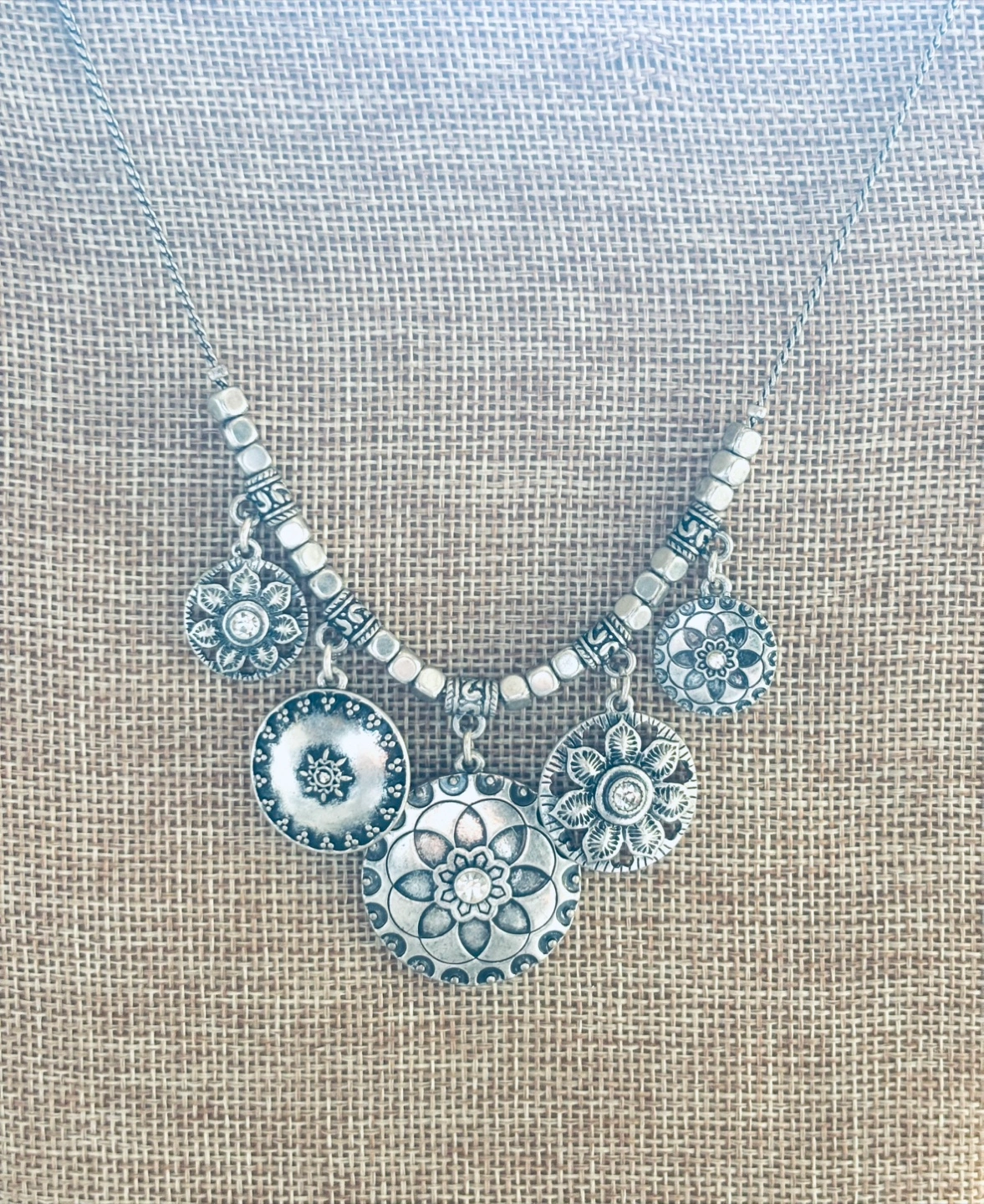 Gorgeous silver tone necklace. Features multiple decorative pendants. Perfect for layering or wearing alone.