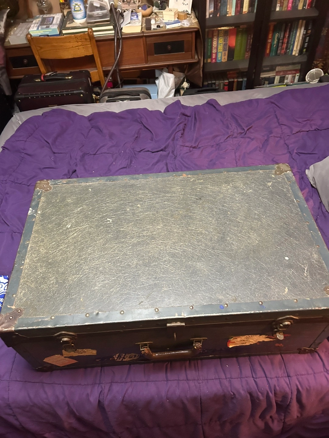 Large vintage suitcase. Green exterior. Metal corners and clasps. Interior shows wear. Several old luggage tags attached. Great for storage or display.