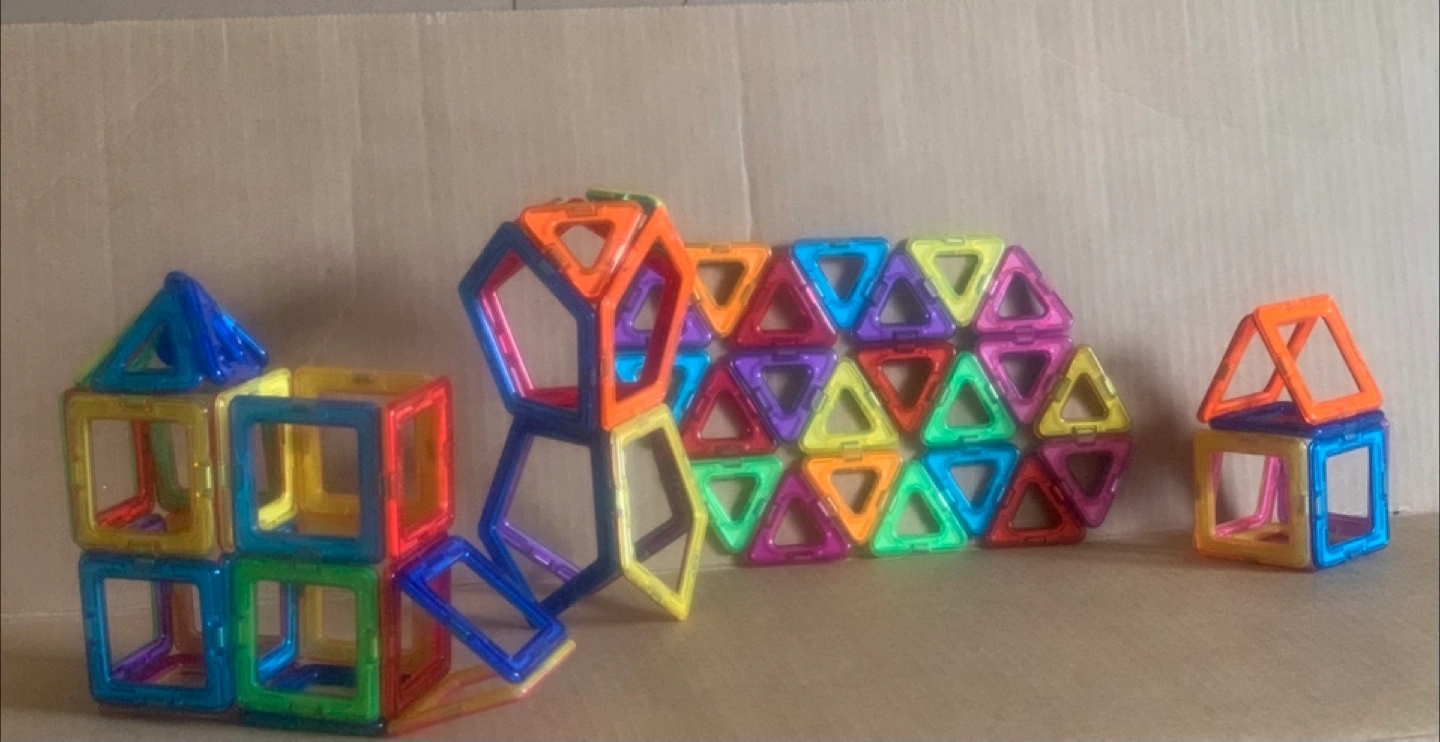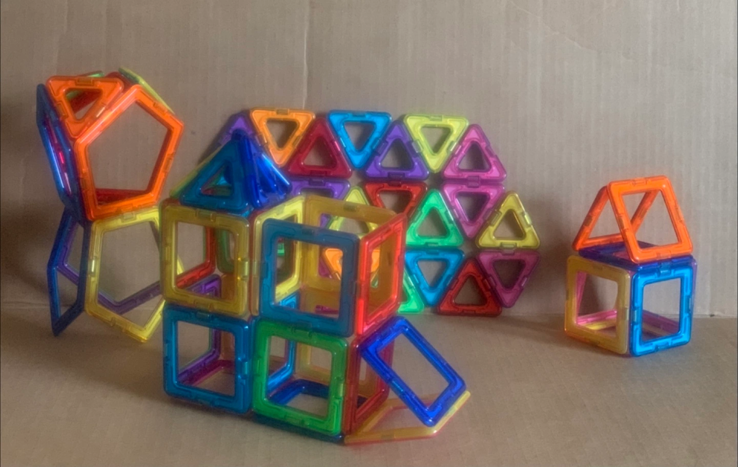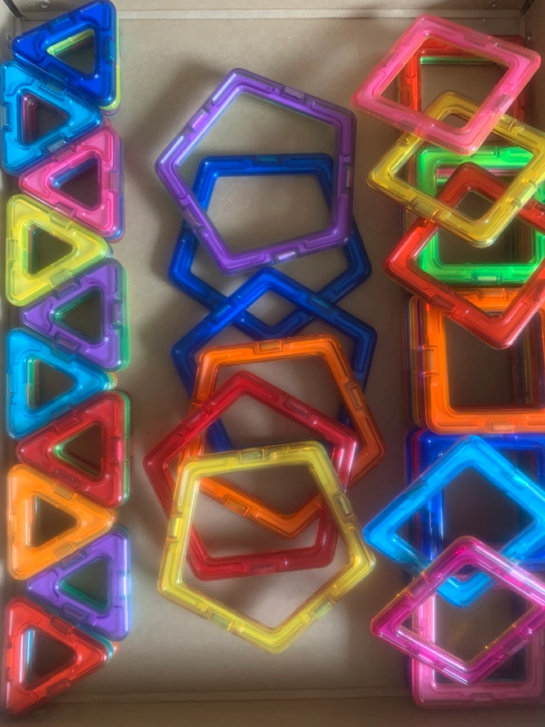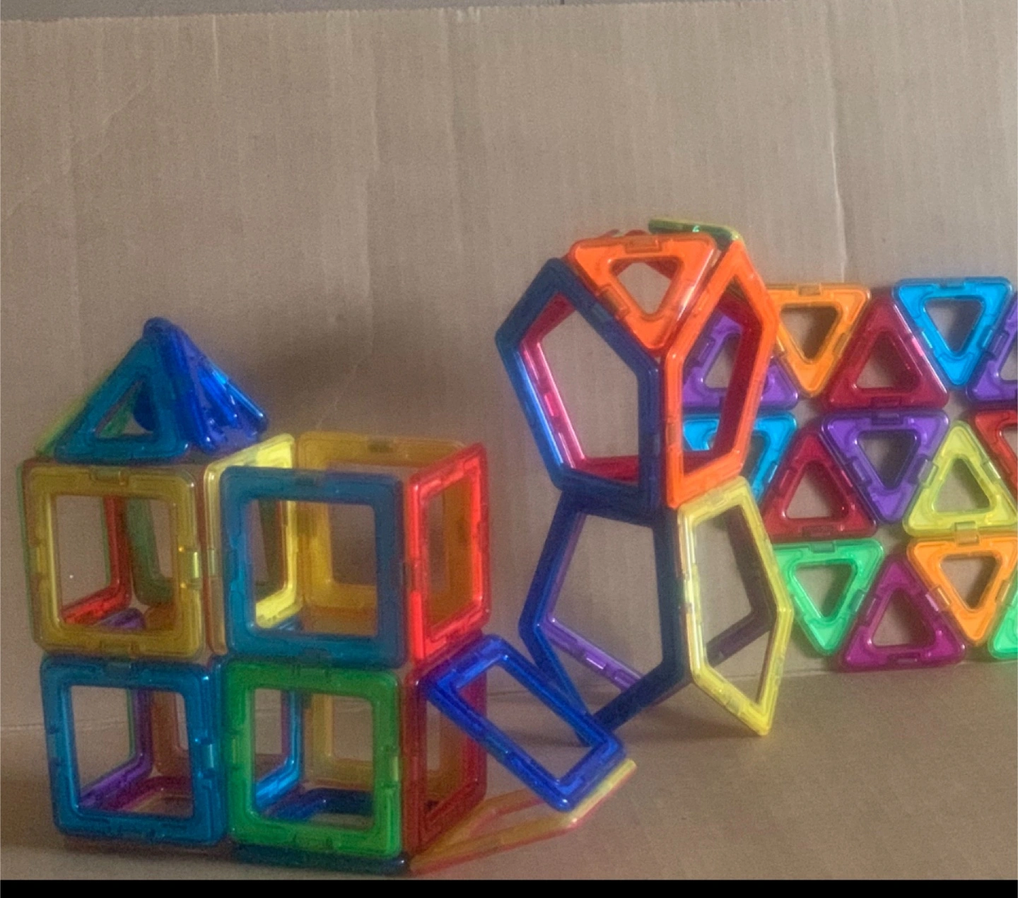 168Colourful magnetic building blocks. Various shapes and sizes. Great for imaginative play. Includes triangles, squares, and pentagons. 61 pieces. Pick up at Eglinton Ave east at Bayview.