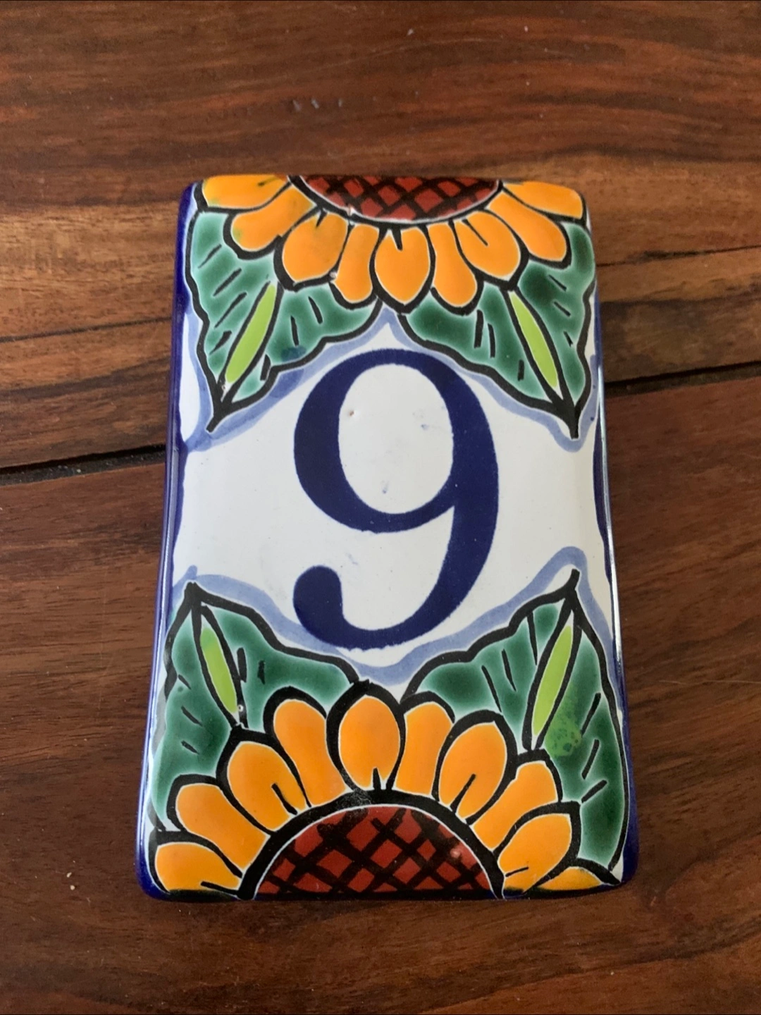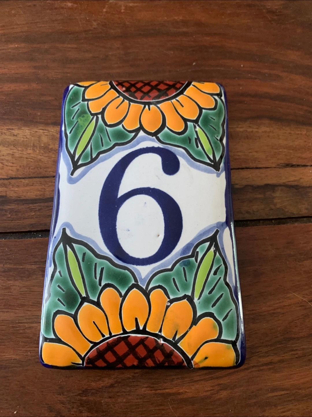 One ceramic house numbers. Hand-painted Talavera style. Features sunflowers. Can be number 6 or9. Perfect for adding a touch of Mexican charm to your home.
