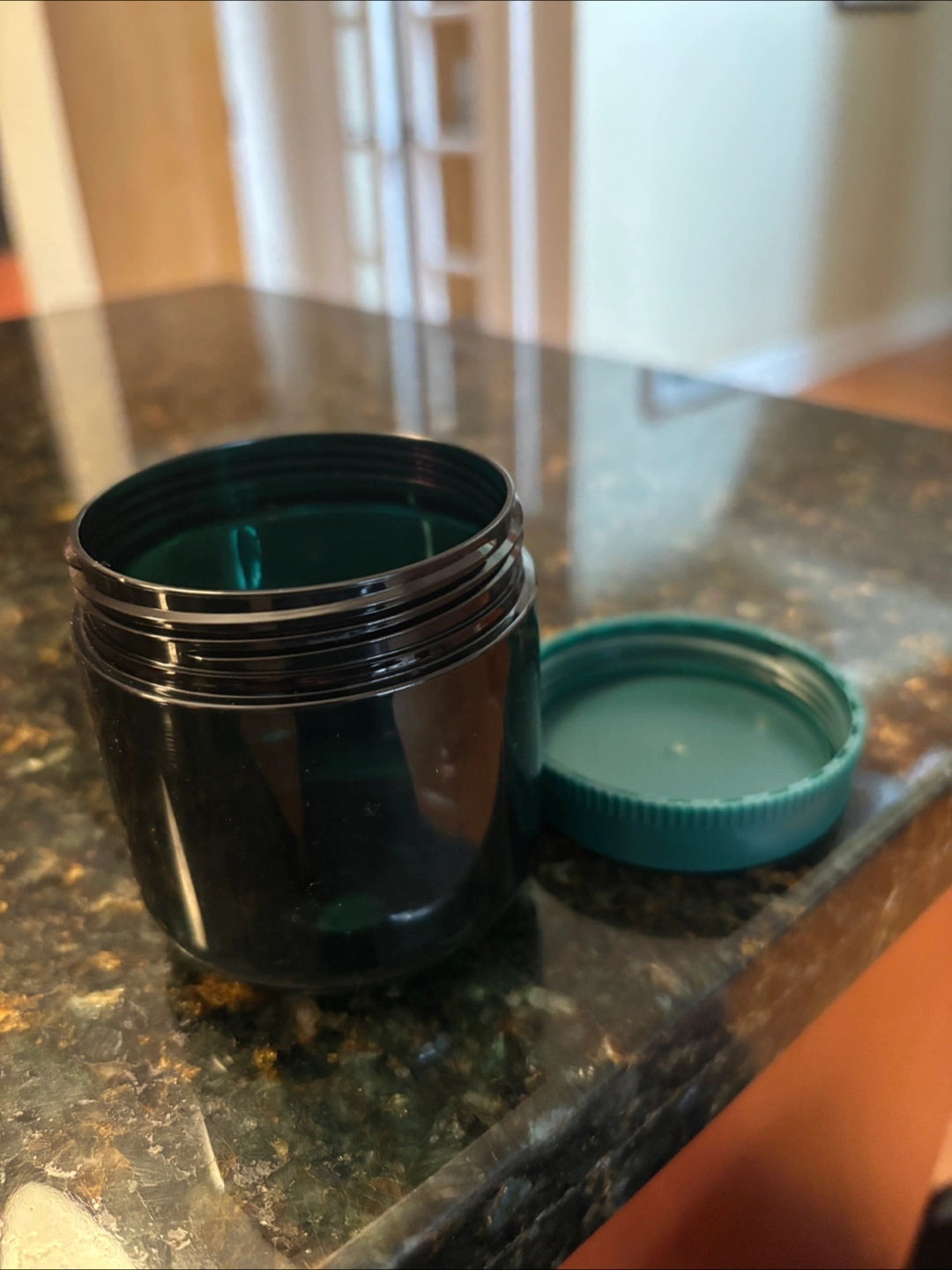 Reusable durable forest green plastic jar with a green lid. Great for storing small items or liquids. Can hold up to 300 ml. From a pet and smoke free home. Pickup only in the St Lawrence market area of downtown Toronto.
