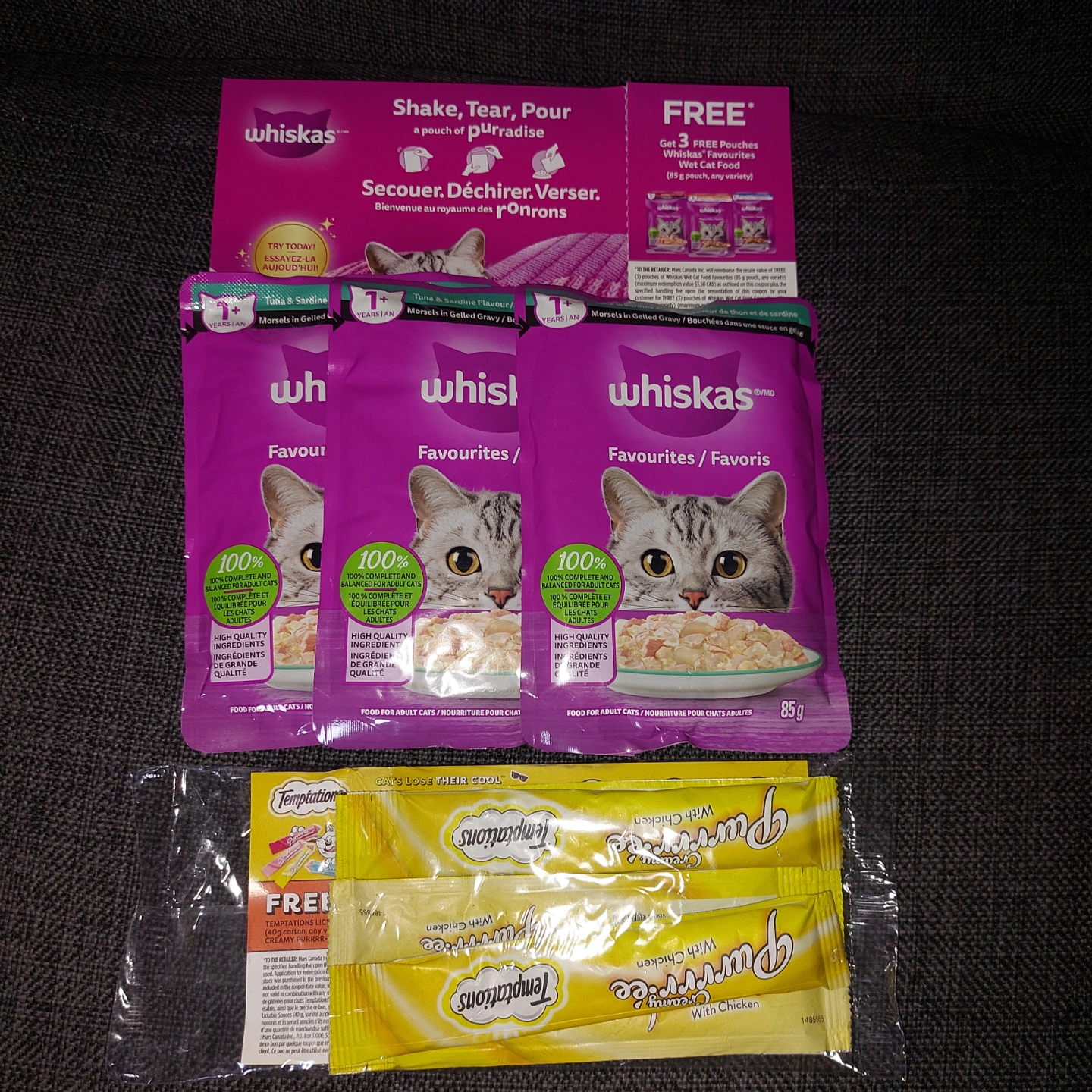 PU: CARLTON/SHERBOURNE AREA Three pouches of Whiskas Favourites wet cat food, tuna and sardine flavour. Also includes three Temptations creamy chicken cat treats. Adult cat food. Plus 2 coupons for FREE cat food and treats